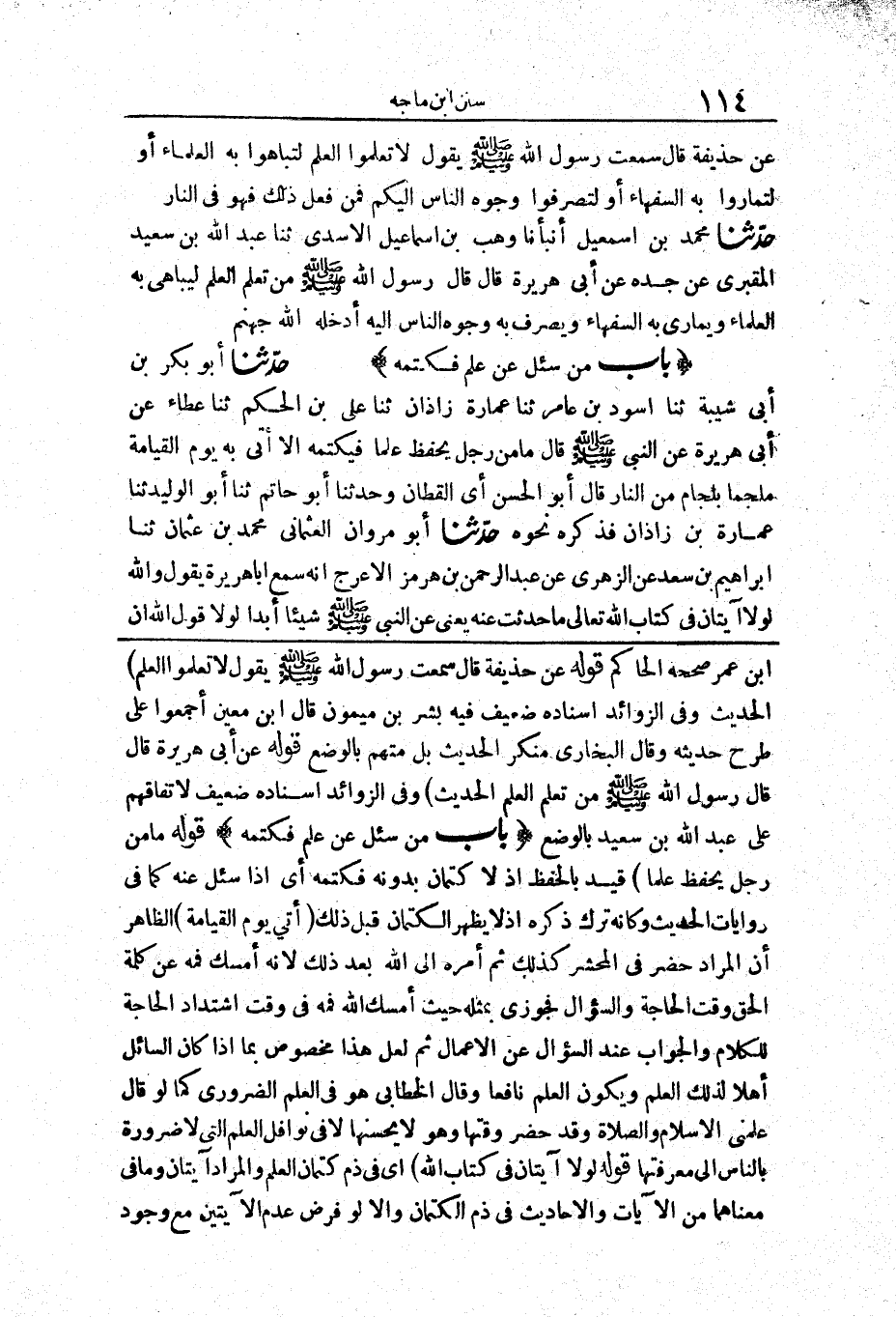 قَوْلُهُ (عَنْ حُذَيْفَةَ قَالَ سَمِعْتُ رَسُولَ اللَّهِ - صَلَّى اللَّهُ عَلَيْهِ وَسَلَّمَ - يَقُولُ لَا تَعَلَّمُوا الْعِلْمَ) الْحَدِيثَ وَفِي الزَّوَائِدِ إِسْنَادُهُ ضَعِيفٌ فِيهِ بِشْرُ بْنُ مَيْمُونَ قَالَ ابْنُ مَعِينٍ أَجْمَعُوا عَلَى طَرْحِ حَدِيثِهِ وَقَالَ الْبُخَارِيُّ مُنْكَرُ الْحَدِيثِ بَلْ مُتَّهَمٌ بِالْوَضْعِ.