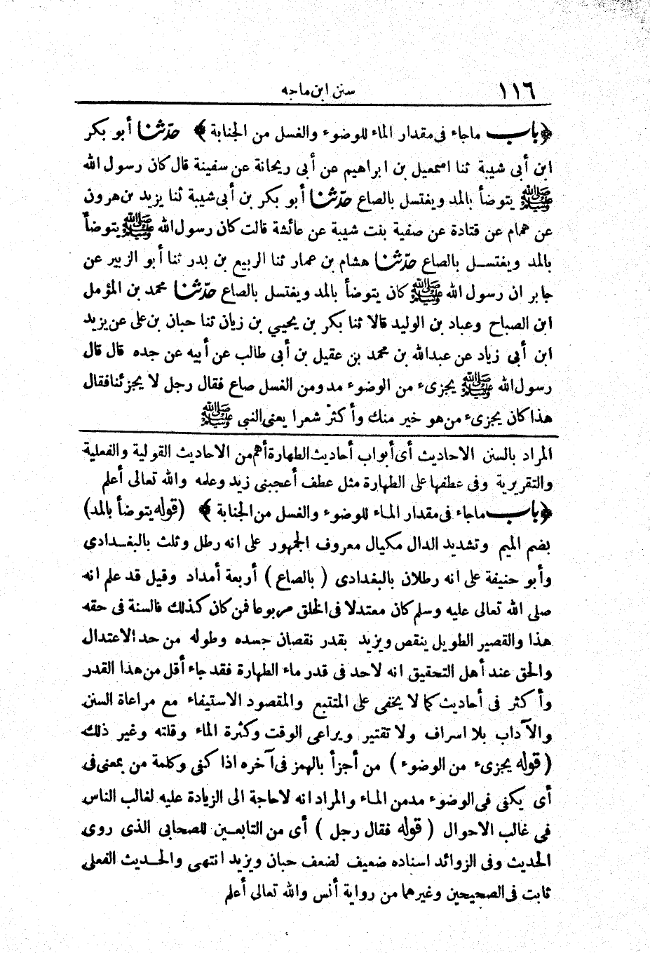 268 - حَدَّثَنَا أَبُو بَكْرِ بْنُ أَبِي شَيْبَةَ حَدَّثَنَا يَزِيدُ بْنُ هَارُونَ عَنْ هَمَّامٍ عَنْ قَتَادَةَ عَنْ صَفِيَّةَ بِنْتِ شَيْبَةَ عَنْ عَائِشَةَ قَالَتْ «كَانَ رَسُولُ اللَّهِ صَلَّى اللَّهُ عَلَيْهِ وَسَلَّمَ يَتَوَضَّأُ بِالْمُدِّ وَيَغْتَسِلُ بِالصَّاعِ»