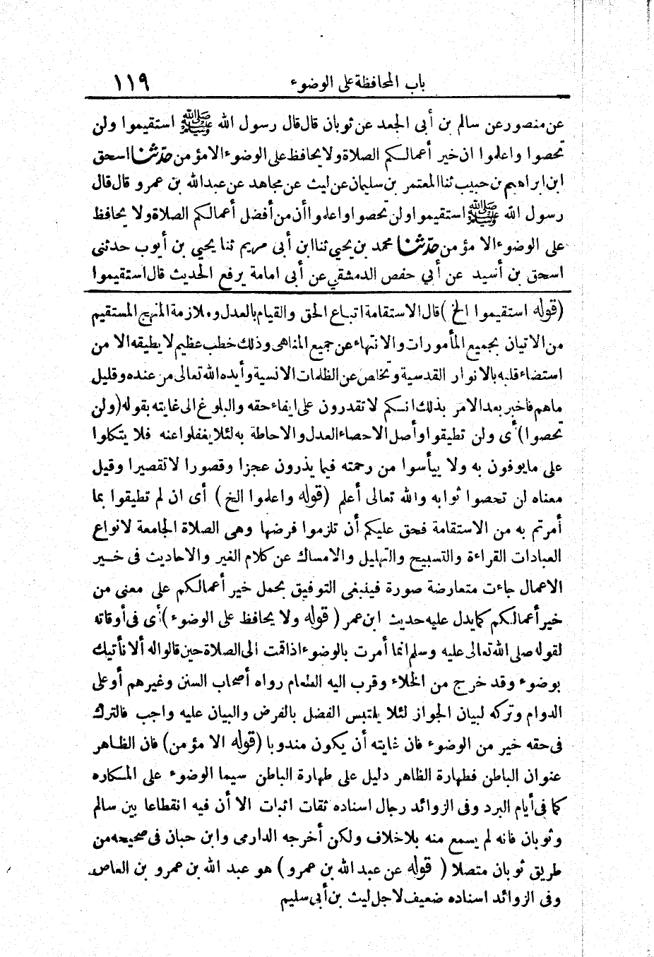 قَوْلُهُ (اسْتَقِيمُوا إِلَخْ) قَالَ الِاسْتِقَامَةُ اتِّبَاعُ الْحَقِّ وَالْقِيَامُ بِالْعَدْلِ وَمُلَازَمَةُ الْمَنْهَجِ الْمُسْتَقِيمِ مِنَ الْإِتْيَانِ بِجَمِيعِ الْمَأْمُورَاتِ وَالِانْتِهَاءِ عَنْ جَمِيعِ الْمَنَاهِي وَذَلِكَ خَطْبٌ عَظِيمٌ لَا يُطِيقُهُ إِلَّا مَنِ اسْتَضَاءَ قَلْبُهُ بِالْأَنْوَارِ الْقُدْسِيَّةِ وَتَخَلَّصَ عَنِ الظُّلُمَاتِ الْإِنْسِيَّةِ وَأَيَّدَهُ اللَّهُ تَعَالَى مِنْ عِنْدِهِ وَقَلِيلٌ مَا هُمْ فَأَخْبَرَ بَعْدَ الْأَمْرِ بِذَلِكَ أَنَّكُمْ لَا تَقْدِرُونَ عَلَى إِيفَاءِ حَقِّهِ وَالْبُلُوغُ إِلَى غَايَتِهِ بِقَوْلِهِ (وَلَنْ تُحْصُوا) أَيْ وَلَنْ تُطِيقُوا وَأَصْلُ الْإِحْصَاءِ الْعَدْلُ وَالْإِحَاطَةُ بِهِ لِئَلَّا يَغْفُلُوا عَنْهُ فَلَا يَتَّكِلُوا عَلَى مَا يُوفُونَ بِهِ وَلَا يَيْأَسُوا مِنْ رَحْمَتِهِ فِيمَا يَذَرُونَ عَجْزًا وَقُصُورًا لَا تَقْصِيرًا وَقِيلَ مَعْنَاهُ لَنْ تُحْصُوا ثَوَابَهُ وَاللَّهُ تَعَالَى أَعْلَمُ قَوْلُهُ (وَاعْلَمُوا إِلَخْ) أَيْ إِنْ لَمْ تُطِيقُوا بِمَا أُمِرْتُمْ بِهِ مِنَ الِاسْتِقَامَةِ فَحَقٌّ عَلَيْكُمْ أَنْ تَلْزَمُوا فَرْضَهَا وَهِيَ الصَّلَاةُ الْجَامِعَةُ لِأَنْوَاعِ الْعِبَادَاتِ الْقِرَاءَةِ وَالتَّسْبِيحِ وَالتَّهْلِيلِ وَالْإِمْسَاكِ عَنْ كَلَامِ الْغَيْرِ وَالْأَحَادِيثُ فِي خَيْرِ الْأَعْمَالِ جَاءَتْ مُتَعَارِضَةً صُورَةً فَيَنْبَغِي التَّوْفِيقُ بِحَمْلِ خَيْرِ أَعْمَالِكُمْ عَلَى مَعْنَى مِنْ خَيْرِ أَعْمَالِكُمْ كَمَا يَدُلُّ عَلَيْهِ حَدِيثُ ابْنِ عُمَرَ قَوْلُهُ (وَلَا يُحَافِظُ عَلَى الْوُضُوءِ) أَيْ فِي أَوْقَاتِهَ لِقَوْلِهِ - صَلَّى اللَّهُ تَعَالَى عَلَيْهِ وَسَلَّمَ - «إِنَّمَا أُمِرْتُ بِالْوُضُوءِ إِذَا قُمْتُ إِلَى الصَّلَاةِ» حِينَ قَالُوا لَهُ أَلَا نَأْتِيكَ بِوُضُوءٍ وَقَدْ خَرَجَ مِنَ الْخَلَاءِ وَقُرِّبَ إِلَيْهِ الطَّعَامُ رَوَاهُ أَصْحَابُ السُّنَنِ وَغَيْرُهُمْ أَوْ عَلَى الدَّوَامِ وَتَرْكُهُ لِبَيَانِ الْجَوَازِ لِئَلَّا يَلْتَبِسَ الْفَضْلُ بِالْفَرْضِ وَالْبَيَانُ عَلَيْهِ وَاجِبٌ فَالتَّرْكُ فِي حَقِّهِ خَيْرٌ مِنَ الْوُضُوءِ فَإِنَّ غَايَتَهُ أَنْ يَكُونَ مَنْدُوبًا قَوْلُهُ (إِلَّا مُؤْمِنٌ) فَإِنَّ الظَّاهِرَ عِنْوَانُ الْبَاطِنِ فَطَهَارَةُ الظَّاهِرِ دَلِيلٌ عَلَى طَهَارَةِ الْبَاطِنِ سِيَّمَا الْوُضُوءُ عَلَى الْمَكَارِهِ كَمَا فِي أَيَّامِ الْبَرْدِ وَفِي الزَّوَائِدِ رِجَالٌ إِسْنَادُهُ ثِقَاتٌ أَثَبَاتٌ إِلَّا أَنَّ فِيهِ انْقِطَاعًا بَيْنَ سَالِمٍ وَثَوْبَانَ فَإِنَّهُ لَمْ يَسْمَعْ مِنْهُ بِلَا خِلَافٍ وَلَكِنْ أَخْرَجَهُ الدَّارِمِيُّ وَابْنُ حِبَّانَ فِي صَحِيحِهِ مِنْ طَرِيقِ ثَوْبَانَ مُتَّصِلًا.