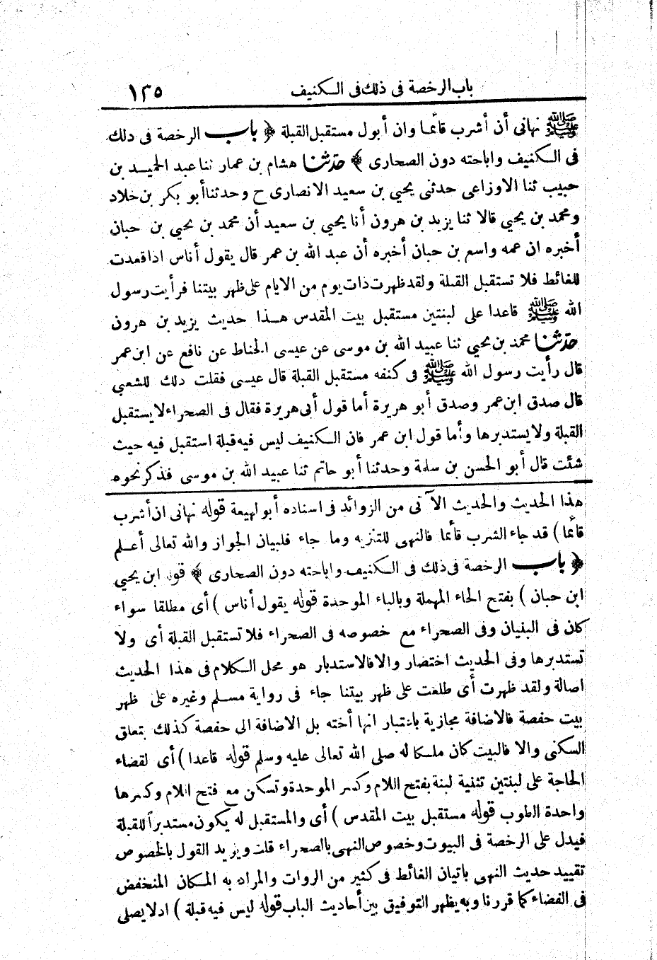 قَوْلُهُ (ابْنَ يَحْيَى بْنِ حَبَّانَ) بِفَتْحِ الْحَاءِ الْمُهْمَلَةِ وَبِالْبَاءِ الْمُوَحَّدَةِ قَوْلُهُ (يَقُولُ أُنَاسٌ) أَيْ مُطْلَقًا سَوَاءٌ كَانَ فِي الْبُنْيَانِ وَفِي الصَّحْرَاءِ مَعَ خُصُوصِهِ فِي الصَّحْرَاءِ فَلَا تَسْتَقْبِلُ الْقِبْلَةَ أَيْ وَلَا تَسْتَدْبِرُهَا وَفِي الْحَدِيثِ اخْتِصَارٌ وَإِلَّا فَالِاسْتِدْبَارُ هُوَ مَحَلُّ الْكَلَامِ فِي هَذَا الْحَدِيثِ أَصَالَةً وَلَقَدْ ظَهَرَتْ أَيْ طَلَعَتْ عَلَى ظَهْرِ بَيْتِنَا جَاءَ فِي رِوَايَةِ مُسْلِمٍ وَغَيْرِهِ عَلَى ظَهْرِ بَيْتِ حَفْصَةَ فَالْإِضَافَةُ مَجَازِيَّةٌ بِاعْتِبَارِ أَنَّهَا أُخْتُهُ بَلِ الْإِضَافَةُ إِلَى حَفْصَةَ كَذَلِكَ بِتَعَلُّقِ السُّكْنَى وَإِلَّا فَالْبَيْتُ كَانَ مِلْكًا لَهُ - صَلَّى اللَّهُ تَعَالَى عَلَيْهِ وَسَلَّمَ - قَوْلُهُ (قَاعِدًا) أَيْ لِقَضَاءِ الْحَاجَةِ عَلَى لَبِنْتَيْنِ تَثْنِيَةُ لَبِنَةٍ بِفَتْحِ اللَّامِ وَكَسْرِ الْمُوَحَّدَةِ وَتُسَكَّنُ مَعَ فَتْحِ اللَّامِ وَكَسْرِهَا وَاحِدَةُ الطُّوبِ قَوْلُهُ (مُسْتَقْبِلَ بَيْتِ الْمَقْدِسِ) أَيْ وَالْمُسْتَقْبِلُ لَهُ يَكُونُ مُسْتَدْبِرًا لِلْقِبْلَةِ فَيَدُلُّ عَلَى الرُّخْصَةِ فِي الْبُيُوتِ وَخُصُوصُ النَّهْيِ بِالصَّحْرَاءِ قُلْتُ وَيُؤَيِّدُ الْقَوْلَ بِالْخُصُوصِ تَقْيِيدُ حَدِيثِ النَّهْيِ بِإِتْيَانِ الْغَائِطِ فِي كَثِيرٍ مِنَ الرِّوَايَاتِ وَالْمُرَادُ بِهِ الْمَكَانُ الْمُنْخَفِضُ فِي الْفَضَاءِ كَمَا قَرَّرْنَا وَبِهِ يَظْهَرُ التَّوْفِيقُ بَيْنَ أَحَادِيثِ الْبَابِ.