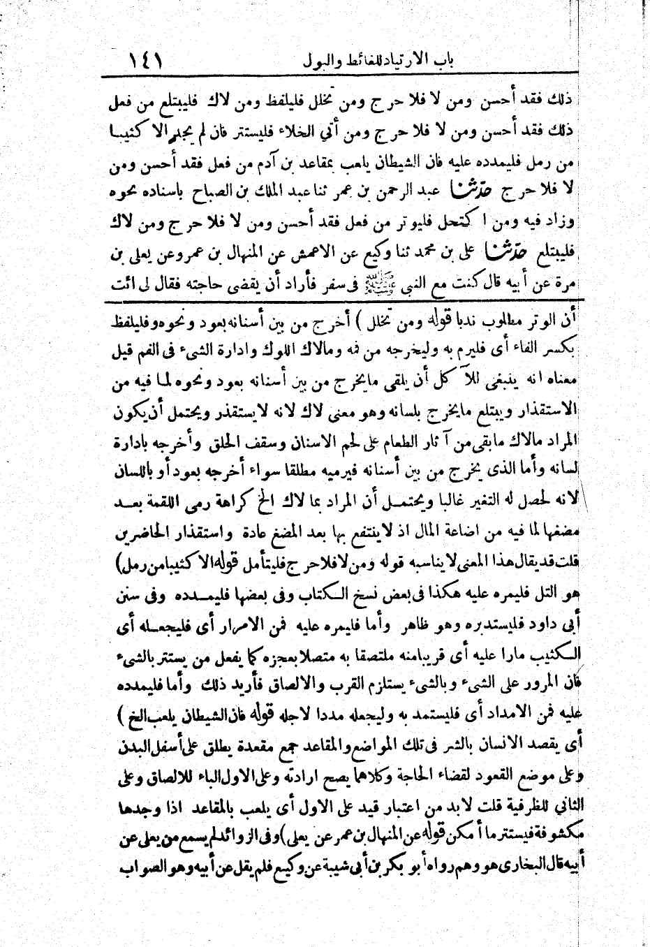 أَنَّ الْوِتْرَ مَطْلُوبٌ نَدْبًا قَوْلُهُ (وَمَنْ تَخَلَّلَ) أَخْرَجَ مِنْ بَيْنِ أَسْنَانِهِ بِعُودٍ وَنَحْوِهِ وَفَلْيَلْفِظْ بِكَسْرِ الْفَاءِ أَيْ فَلْيَرْمِ بِهِ وَلْيُخْرِجْهُ مِنْ فَمِهِ وَمَا لَاكَ اللَّوْكُ وَإِدَارَةُ الشَّيْءِ فِي الْفَمِ قِيلَ مَعْنَاهُ أَنَّهُ يَنْبَغِي لِلْآكِلِ أَنْ يُلْقِيَ مَا يَخْرُجُ مِنْ بَيْنَ أَسْنَانِهِ بِعُودٍ وَنَحْوِهِ لِمَا فِيهِ مِنَ الِاسْتِقْذَارِ وَيَبْتَلِعُ مَا يَخْرُجُ بِلِسَانِهِ وَهُوَ مَعْنَى لَاكَ لِأَنَّهُ لَا يُسْتَقْذَرُ وَيَحْتَمِلُ أَنْ يَكُونَ الْمُرَادُ مَا لَاكَ مَا بَقِيَ مِنْ آثَارِ الطَّعَامِ عَلَى لَحْمِ الْأَسْنَانِ وَسَقْفِ الْحَلْقِ وَأَخْرَجَهُ بِإِدَارَةِ لِسَانِهِ وَأَمَّا الَّذِي يَخْرُجُ مِنْ بَيْنِ أَسْنَانِهِ فَيَرْمِيهِ مُطْلَقًا سَوَاءٌ أَخْرَجَهُ بِعُودٍ أَوْ بِاللِّسَانِ لِأَنَّهُ حَصَلَ لَهُ التَّغَيُّرُ غَالِبًا وَيَحْتَمِلُ أَنَّ الْمُرَادَ بِمَا لَاكَ إِلَخْ كَرَاهَةُ رَمْيِ اللُّقْمَةِ بَعْدَ مَضْغِهَا لِمَا فِيهِ مِنْ إِضَاعَةِ الْمَالِ إِذْ لَا يُنْتَفَعُ بِهَا بَعْدَ الْمَضْغِ عَادَةً وَاسْتِقْذَارُ الْحَاضِرِينَ قُلْتُ قَدْ يُقَالُ هَذَا الْمَعْنَى لَا يُنَاسِبُهُ قَوْلُهُ وَمَنْ لَا فَلَا حَرَجَ فَلْيُتَأَمَّلْ قَوْلُهُ (إِلَّا كَثِيبًا مِنْ رَمْلٍ) هُوَ التَّلُّ فَلْيُمِرَّهُ عَلَيْهِ هَكَذَا فِي بَعْضِ نُسَخِ الْكِتَابِ وَفِي بَعْضِهَا فَلْيُمْدِدْهُ وَفِي سُنَنِ أَبِي دَاوُدَ فَلْيَسْتَدْبِرْهُ وَهُوَ ظَاهِرٌ وَأَمَّا فَلْيُمِرَّهُ عَلَيْهِ فَمِنَ الْإِمْرَارِ أَيْ فَلْيَجْعَلْهُ أَيِ الْكَثِيبَ مَارًّا عَلَيْهِ أَيْ قَرِيبًا مِنْهُ مُلْتَصِقًا بِهِ مُتَّصِلًا بِعَجُزِهِ كَمَا يَفْعَلُ مَنْ يَسْتَتِرُ بِالشَّيْءِ فَإِنَّ الْمُرُورَ عَلَى الشَّيْءِ وَبِالشَّيْءِ يَسْتَلْزِمُ الْقُرْبَ وَالْإِلْصَاقَ فَأُرِيدَ ذَلِكَ وَأَمَّا فَلْيُمْدِدْهُ عَلَيْهِ فَمِنَ الْإِمْدَادِ أَيْ فَلْيَسْتَمِدَّ بِهِ وَلْيَجْعَلْهُ مَدَدًا لِأَجْلِهِ قَوْلُهُ (فَإِنَّ الشَّيْطَانَ يَلْعَبُ إِلَخْ) أَيْ يَقْصِدُ الْإِنْسَانَ بِالشَّرِّ فِي تِلْكَ الْمَوَاضِعِ وَالْمَقَاعِدِ جَمْعُ مَقْعَدَةٍ يُطْلَقُ عَلَى أَسْفَلِ الْبَدَنِ وَعَلَى مَوْضِعِ الْقُعُودِ لِقَضَاءِ الْحَاجَةِ وَكِلَاهُمَا يَصِحُّ إِرَادَتُهُ وَعَلَى الْأَوَّلِ الْبَاءُ لِلْإِلْصَاقِ وَعَلَى الثَّانِي لِلظَّرْفِيَّةِ قُلْتُ لَا بُدَّ مِنِ اعْتِبَارِ قَيْدٍ عَلَى الْأَوَّلِ أَيْ يَلْعَبُ بِالْمَقَاعِدِ إِذَا وَجَدَهَا مَكْشُوفَةً فَيَسْتَتِرُ مَا أَمْكَنَ.