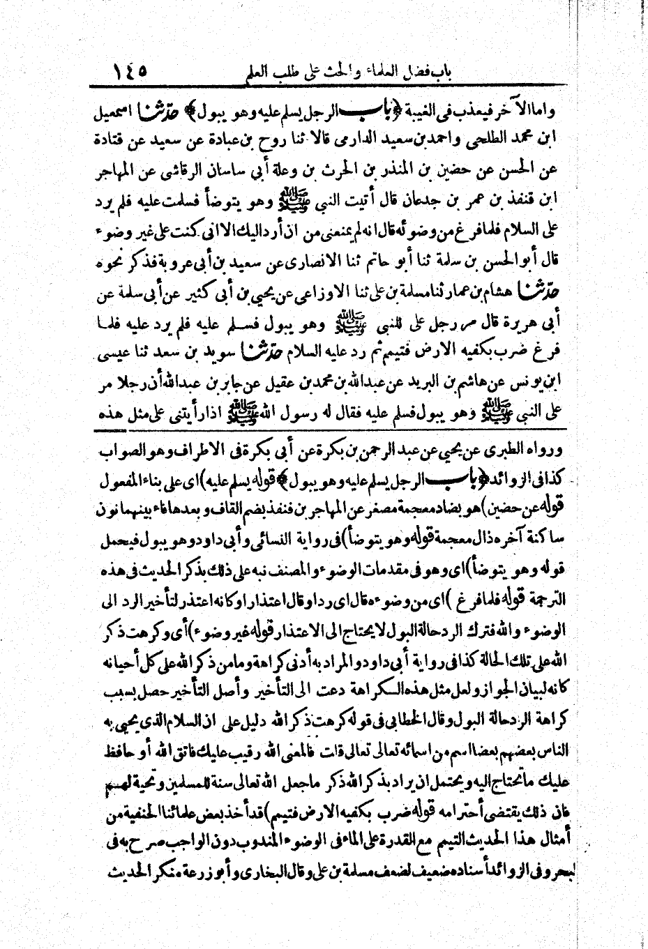 350 - حَدَّثَنَا إِسْمَعِيلُ بْنُ مُحَمَّدٍ الطَّلْحِيُّ وَأَحْمَدُ بْنُ سَعِيدٍ الدَّارِمِيُّ قَالَا حَدَّثَنَا رَوْحُ بْنُ عُبَادَةَ عَنْ سَعِيدٍ عَنْ قَتَادَةَ عَنْ الْحَسَنِ عَنْ حُضَيْنِ بْنِ الْمُنْذِرِ بْنِ الْحَارِثِ بْنِ وَعْلَةَ أَبِي سَاسَانَ الرَّقَاشِيِّ عَنْ الْمُهَاجِرِ بْنِ قُنْفُذِ بْنِ عَمْرِو بْنِ جُدْعَانَ قَالَ «أَتَيْتُ النَّبِيَّ صَلَّى اللَّهُ عَلَيْهِ وَسَلَّمَ وَهُوَ يَتَوَضَّأُ فَسَلَّمْتُ عَلَيْهِ فَلَمْ يَرُدَّ عَلَيَّ السَّلَامَ فَلَمَّا فَرَغَ مِنْ وُضُوئِهِ قَالَ إِنَّهُ لَمْ يَمْنَعْنِي مِنْ أَنْ أَرُدَّ إِلَيْكَ إِلَّا أَنِّي كُنْتُ عَلَى غَيْرِ وُضُوءٍ» قَالَ أَبُو الْحَسَنِ بْنُ سَلَمَةَ حَدَّثَنَا أَبُو حَاتِمٍ حَدَّثَنَا الْأَنْصَارِيُّ عَنْ سَعِيدِ بْنِ أَبِي عَرُوبَةَ فَذَكَرَ نَحْوَهُ