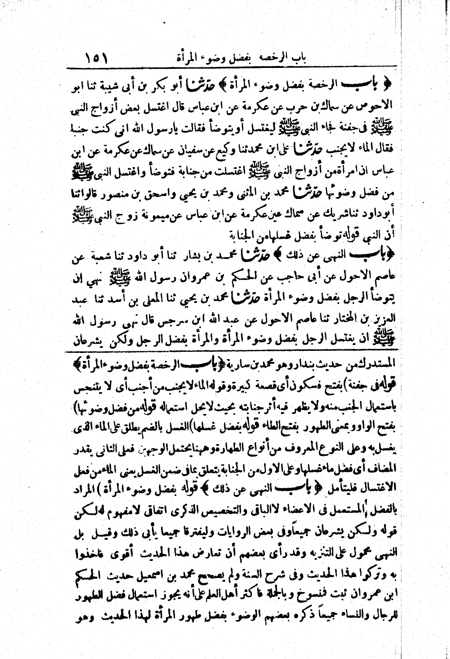قَوْلُهُ (بِفَضْلِ وُضُوءِ الْمَرْأَةِ) الْمُرَادُ بِالْفَضْلِ الْمُسْتَعْمَلُ فِي الْأَعْضَاءِ لَا الْبَاقِي وَالتَّخْصِيصُ الذِّكْرِيُّ اتِّفَاقِيٌّ لَا مَفْهُومَ لَهُ لَكِنَّ قَوْلَهُ وَلَكِنْ يُشْرَعَانِ جَمِيعًا وَفِي بَعْضِ الرِّوَايَاتِ وَلْيَفْتَرِقَا جَمِيعًا يَأْبَى ذَلِكَ وَقِيلَ بَلِ النَّهْيُ مَحْمُولٌ عَلَى التَّنْزِيهِ وَقَدْ رَأَى بَعْضُهُمْ أَنَّ تَعَارُضَ هَذَا الْحَدِيثِ أَقْوَى فَأَخَذُوا بِهِ وَتَرَكُوا هَذَا الْحَدِيثَ وَفِي شَرْحِ السُّنَّةِ وَلَمْ يُصَحِّحْ مُحَمَّدُ بْنُ إِسْمَاعِيلَ حَدِيثَ الْحَكَمِ بْنِ عَمْرٍو وَإِنْ ثَبَتَ فَمَنْسُوخٌ وَبِالْجُمْلَةِ فَأَكْثَرُ أَهْلِ الْعِلْمِ عَلَى أَنَّهُ يَجُوزُ اسْتِعْمَالُ فَضْلِ الطَّهُورِ لِلرِّجَالِ وَالنِّسَاءِ جَمِيعًا ذَكَرَهُ بَعْضُهُمُ الْوُضُوءُ بِفَضْلِ طَهُورِ الْمَرْأَةِ لِهَذَا الْحَدِيثِ وَهُوَ