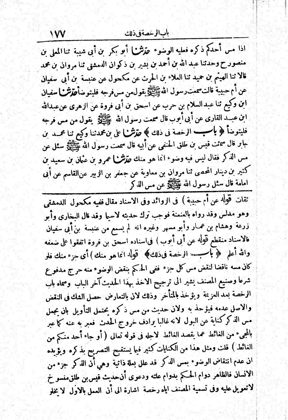 481 - حَدَّثَنَا أَبُو بَكْرِ بْنُ أَبِي شَيْبَةَ حَدَّثَنَا الْمُعَلَّى بْنُ مَنْصُورٍ ح وَحَدَّثَنَا عَبْدُ اللَّهِ بْنُ أَحْمَدَ بْنِ بَشِيرِ بْنِ ذَكْوَانَ الدِّمَشْقِيُّ حَدَّثَنَا مَرْوَانُ بْنُ مُحَمَّدٍ قَالَا حَدَّثَنَا الْهَيْثَمُ بْنُ حُمَيْدٍ حَدَّثَنَا الْعَلَاءُ بْنُ الْحَارِثِ عَنْ مَكْحُولٍ عَنْ عَنْبَسَةَ بْنِ أَبِي سُفْيَانَ عَنْ أُمِّ حَبِيبَةَ قَالَتْ «سَمِعْتُ رَسُولَ اللَّهِ صَلَّى اللَّهُ عَلَيْهِ وَسَلَّمَ يَقُولُ مَنْ مَسَّ فَرْجَهُ فَلْيَتَوَضَّأْ»