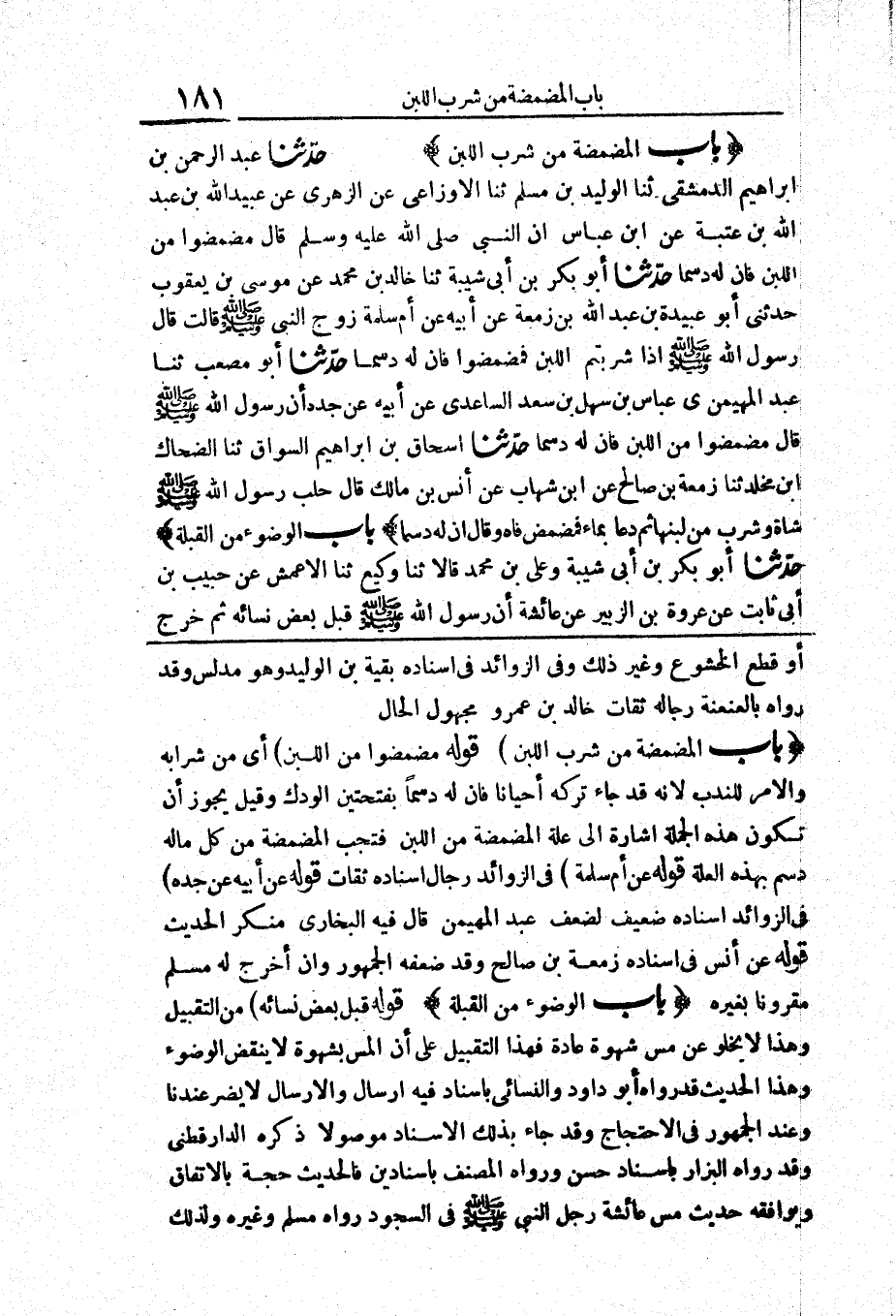 498 - حَدَّثَنَا عَبْدُ الرَّحْمَنِ بْنُ إِبْرَاهِيمَ الدِّمَشْقِيُّ حَدَّثَنَا الْوَلِيدُ بْنُ مُسْلِمٍ حَدَّثَنَا الْأَوْزَاعِيُّ عَنْ الزُّهْرِيِّ عَنْ عُبَيْدِ اللَّهِ بْنِ عَبْدِ اللَّهِ بْنِ عُتْبَةَ عَنْ ابْنِ عَبَّاسٍ «أَنَّ النَّبِيَّ صَلَّى اللَّهُ عَلَيْهِ وَسَلَّمَ قَالَ مَضْمِضُوا مِنْ اللَّبَنِ فَإِنَّ لَهُ دَسَمًا»