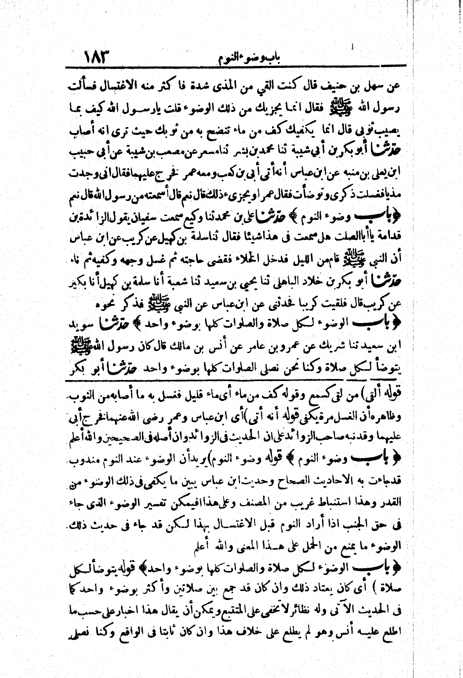 قَوْلُهُ (وُضُوءُ النَّوْمِ) يُرِيدُ أَنَّ الْوُضُوءَ عِنْدَ النَّوْمِ مَنْدُوبٌ قَدْ جَاءَتْ بِهِ الْأَحَادِيثُ الصِّحَاحُ وَحَدِيثُ ابْنِ عَبَّاسٍ يُبَيِّنُ مَا يَكْفِي فِي ذَلِكَ الْوُضُوءِ مِنَ الْقَدْرِ وَهَذَا اسْتِنْبَاطٌ غَرِيبٌ مِنَ الْمُصَنِّفِ وَعَلَى هَذَا أَفَيُمْكِنُ تَفْسِيرُ الْوُضُوءِ الَّذِي جَاءَ فِي حَقِّ الْجُنُبِ إِذَا أَرَادَ النَّوْمَ قَبْلَ الِاغْتِسَالِ بِهَذَا لَكِنْ قَدْ جَاءَ فِي حَدِيثِ ذَلِكَ الْوُضُوءِ مَا يَمْنَعُ مِنَ الْحَمْلِ عَلَى هَذَا الْمَعْنَى وَاللَّهُ أَعْلَمُ.