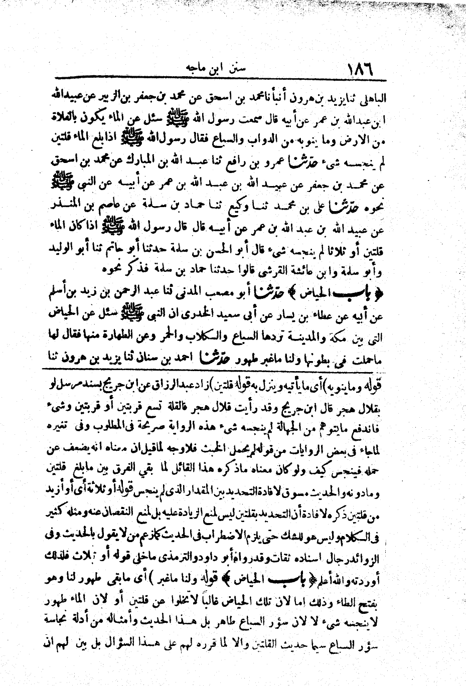 517 - حَدَّثَنَا أَبُو بَكْرِ بْنُ خَلَّادٍ الْبَاهِلِيُّ حَدَّثَنَا يَزِيدُ بْنُ هَارُونَ أَنْبَأَنَا مُحَمَّدُ بْنُ إِسْحَقَ عَنْ مُحَمَّدِ بْنِ جَعْفَرِ بْنِ الزُّبَيْرِ عَنْ عُبَيْدِ اللَّهِ بْنِ عَبْدِ اللَّهِ بْنِ عُمَرَ عَنْ أَبِيهِ قَالَ «سَمِعْتُ رَسُولَ اللَّهِ صَلَّى اللَّهُ عَلَيْهِ وَسَلَّمَ سُئِلَ عَنْ الْمَاءِ يَكُونُ بِالْفَلَاةِ مِنْ الْأَرْضِ وَمَا يَنُوبُهُ مِنْ الدَّوَابِّ وَالسِّبَاعِ فَقَالَ رَسُولُ اللَّهِ صَلَّى اللَّهُ عَلَيْهِ وَسَلَّمَ إِذَا بَلَغَ الْمَاءُ قُلَّتَيْنِ لَمْ يُنَجِّسْهُ شَيْءٌ» حَدَّثَنَا عَمْرُو بْنُ رَافِعٍ حَدَّثَنَا عَبْدُ اللَّهِ بْنُ الْمُبَارَكِ عَنْ مُحَمَّدِ بْنِ إِسْحَقَ عَنْ مُحَمَّدِ بْنِ جَعْفَرٍ عَنْ عُبَيْدِ اللَّهِ بْنِ عَبْدِ اللَّهِ بْنِ عُمَرَ عَنْ أَبِيهِ عَنْ النَّبِيِّ صَلَّى اللَّهُ عَلَيْهِ وَسَلَّمَ نَحْوَهُ