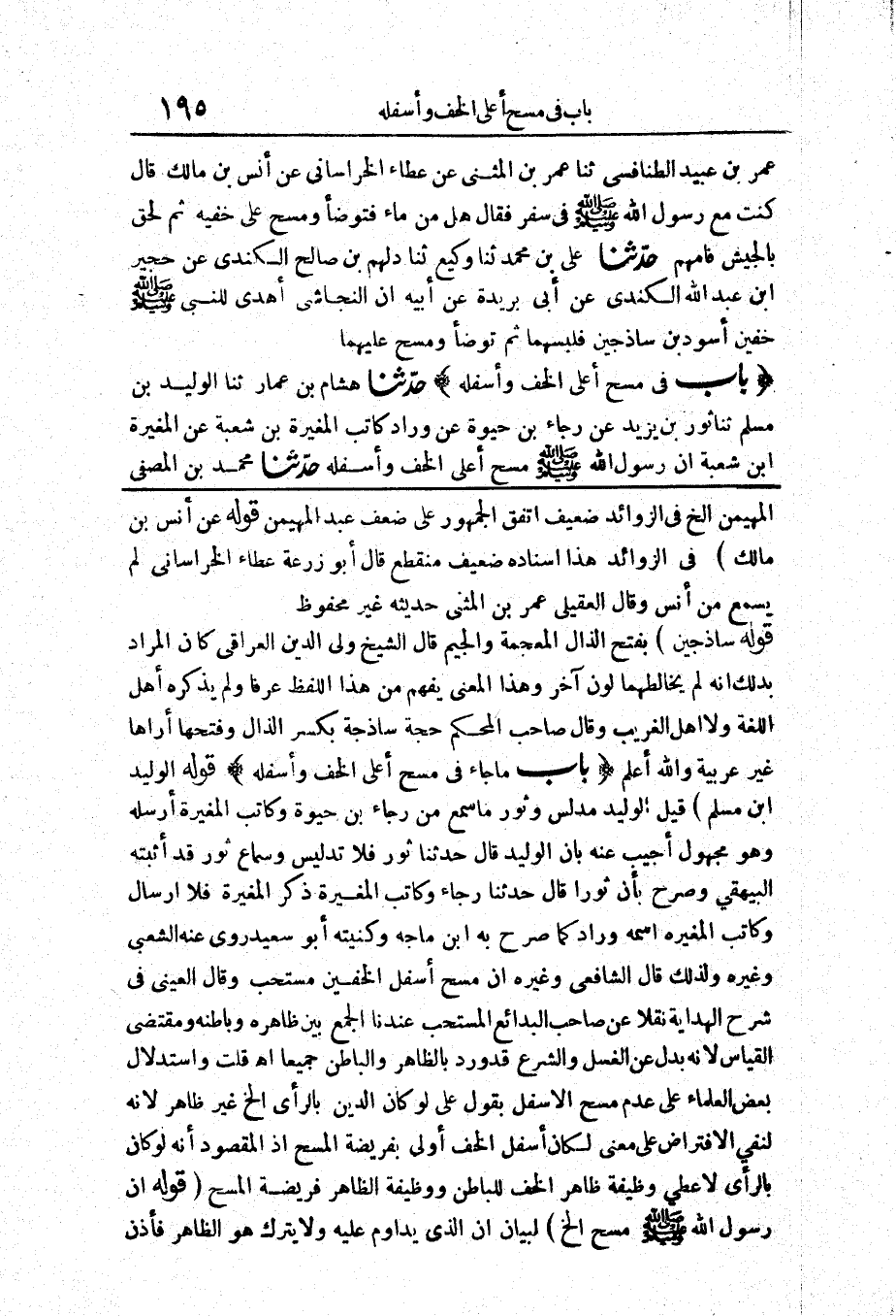 قُلْتُ: وَاسْتِدْلَالُ بَعْضِ الْعُلَمَاءِ عَلَى عَدَمِ مَسْحِ الْأَسْفَلِ بِقَوْلِ عَلِيٍّ لَوْ كَانَ الدِّينُ بِالرَّأْيِ إِلَخْ غَيْرُ ظَاهِرٍ لِأَنَّهُ لِنَفْيِ الِافْتِرَاضِ عَلَى مَعْنًى لَكَانْ أَسْفَلُ الْخُفِّ أَوْلَى بِفَرِيضَةِ الْمَسْحِ إِذِ الْمَقْصُودُ أَنَّهُ لَوْ كَانَ بِالرَّأْيِ لَأُعْطِيَ وَظِيفَةَ ظَاهِرِ الْخُفِّ لِلْبَاطِنِ وَوَظِيفَةُ الظَّاهِرِ فَرِيضَةُ الْمَسْحِ قَوْلُهُ: (أَنَّ رَسُولَ اللَّهِ ـ صَلَّى اللَّهُ عَلَيْهِ وَسَلَّمَ ـ مَسَحَ إِلَخْ) لِبَيَانِ أَنَّ الَّذِي يُدَاوِمُ عَلَيْهِ وَلَا يَتْرُكُ هُوَ الظَّاهِرُ فَإِذَنْ
