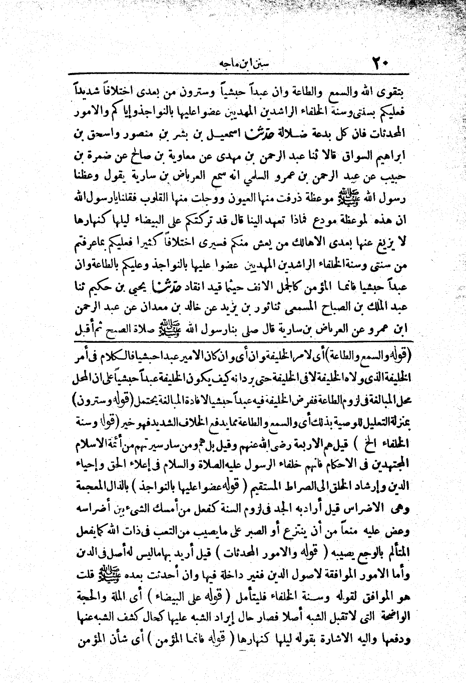 قَوْلُهُ (وَالسَّمْعُ وَالطَّاعَةُ) أَيْ لِأَمْرِ الْخَلِيفَةِ وَإِنْ أَيْ وَإِنْ كَانَ الْأَمِيرُ عَبْدًا حَبَشِيًّا فَالْكَلَامُ فِي أَمْرِ الْخَلِيفَةِ الَّذِي وَلَّاهُ الْخَلِيفَةُ لَا فِي الْخَلِيفَةِ حَتَّى يَرِدَ أَنَّهُ كَيْفَ يَكُونُ الْخَلِيفَةُ عَبْدًا حَبَشِيًّا عَلَى أَنَّ الْمَحَلَّ مَحَلُّ الْمُبَالَغَةِ فِي لُزُومِ الطَّاعَةِ فَفَرَضَ الْخَلِيفَةُ فِيهِ عَبْدًا حَبَشِيًّا لِإِفَادَةِ الْمُبَالَغَةِ يَحْتَمِلُ قَوْلُهُ: (وَسَتَرَوْنَ) بِمَنْزِلَةِ التَّعْلِيلِ لِلْوَصِيَّةِ بِذَلِكَ أَيْ وَالسَّمْعُ وَالطَّاعَةُ مِمَّا يَدْفَعُ الْخِلَافَ الشَّدِيدَ فَهُوَ خَيْرٌ قَوْلُهُ: (وَسُنَّةُ الْخُلَفَاءِ إِلَخْ) قِيلَ: هُمُ الْأَرْبَعَةُ - رَضِيَ اللَّهُ عَنْهُمْ - وَقِيلَ: بَلْ هُمْ وَمَنْ سَارَ سِيرَتَهُمْ مِنْ أَئِمَّةِ الْإِسْلَامِ الْمُجْتَهِدِينَ فِي الْأَحْكَامِ فَإِنَّهُمْ خُلَفَاءُ الرَّسُولِ - عَلَيْهِ الصَّلَاةُ وَالسَّلَامُ - فِي إِعْلَاءِ الْحَقِّ وَإِحْيَاءِ الدِّينِ وَإِرْشَادِ الْخَلْقِ إِلَى الصِّرَاطِ الْمُسْتَقِيمِ قَوْلُهُ: (عَضُّوا عَلَيْهَا بِالنَّوَاجِذِ) بِالذَّالِ الْمُعْجَمَةِ وَهِيَ الْأَضْرَاسُ قِيلَ: أَرَادَ بِهِ الْجِدَّ فِي لُزُومِ السُّنَّةِ كَفِعْلِ مَنْ أَمْسَكَ الشَّيْءَ بَيْنَ أَضْرَاسِهِ وَعَضَّ عَلَيْهِ مَنْعًا مِنْ أَنْ يَنْتَزِعَ أَوِ الصَّبْرَ عَلَى مَا يُصِيبُ مِنَ التَّعَبِ فِي ذَاتِ اللَّهِ كَمَا يَفْعَلُ الْمُتَأَلِّمُ بِالْوَجَعِ يُصِيبُهُ قَوْلُهُ: (وَالْأُمُورَ الْمُحْدَثَاتِ) قِيلَ: أُرِيدُ بِهَا مَا لَيْسَ لَهُ أَصْلٌ فِي الدِّينِ وَأَمَّا الْأُمُورُ الْمُوَافِقَةُ لِأُصُولِ الدِّينِ فَغَيْرُ دَاخِلَةٍ فِيهَا وَإِنْ أُحْدِثَتْ بَعْدَهُ ـ صَلَّى اللَّهُ عَلَيْهِ وَسَلَّمَ ـ قُلْتُ: هُوَ الْمُوَافِقُ لِقَوْلِهِ وَسُنَّةِ الْخُلَفَاءِ فَلْيُتَأَمَّلْ.