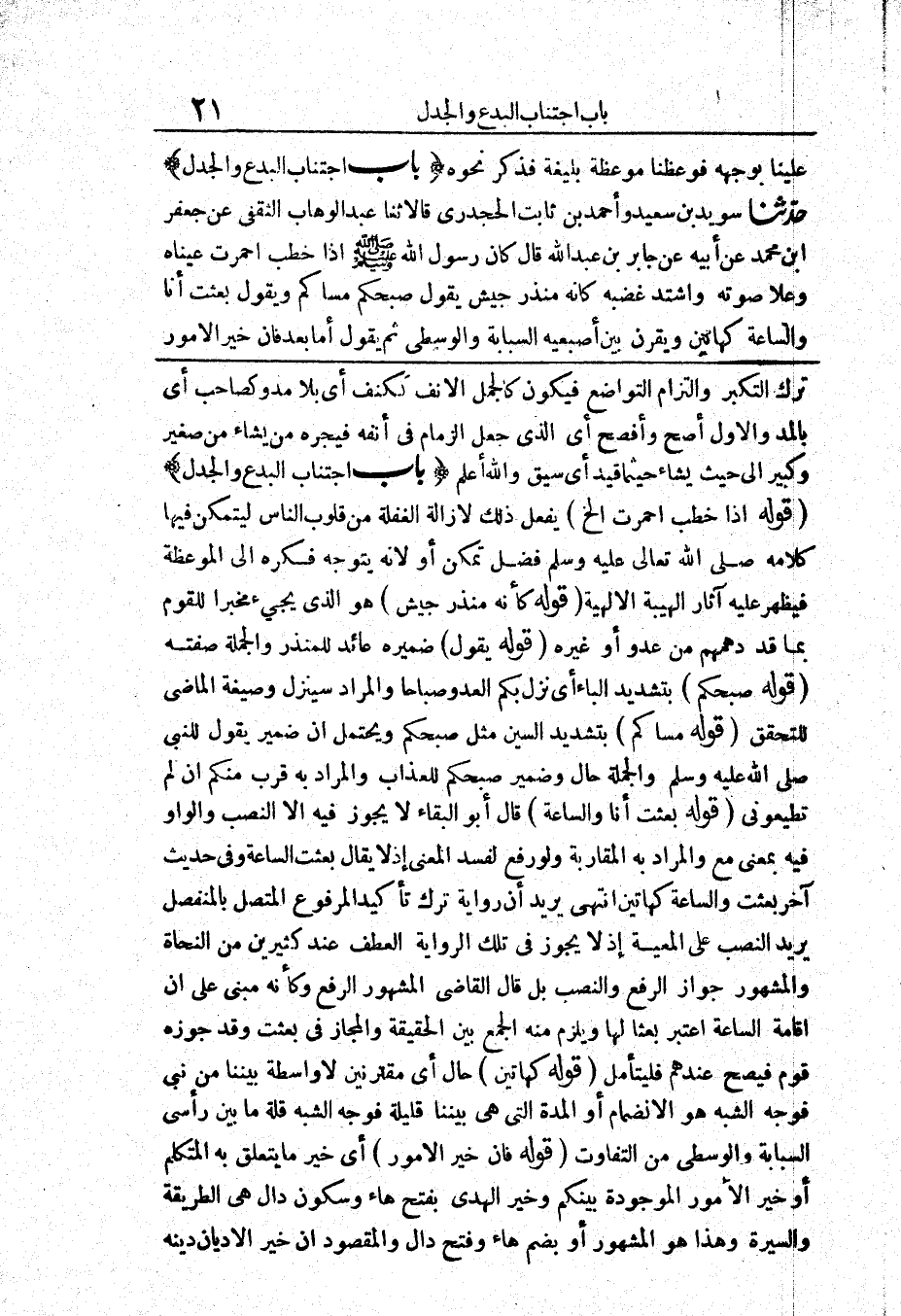 يُرِيدُ أَنَّ رِوَايَةَ تَرْكِ تَأْكِيدِ الْمَرْفُوعِ الْمُتَّصِلِ بِالْمُنْفَصِلِ يُرِيدُ النَّصْبَ عَلَى الْمَعِيَّةِ إِذْ لَا يَجُوزُ فِي تِلْكَ الرِّوَايَةِ الْعَطْفُ عِنْدَ كَثِيرِينَ مِنَ النُّحَاةِ، وَالْمَشْهُورُ جَوَازُ الرَّفْعِ وَالنَّصْبِ بَلْ قَالَ الْقَاضِي: الْمَشْهُورُ الرَّفْعُ وَكَأَنَّهُ مَبْنِيٌّ عَلَى أَنَّ إِقَامَةَ السَّاعَةِ اعْتُبِرَ بَعْثًا لَهَا وَيَلْزَمُ مِنْهُ الْجَمْعُ بَيْنَ الْحَقِيقَةِ وَالْمَجَازِ فِي بُعِثْتُ وَقَدْ جَوَّزَهُ قَوْمٌ فَيَصِحُّ عِنْدَهُمْ فَلْيُتَأَمَّلْ قَوْلُهُ: (كَهَاتَيْنِ) حَالٌ أَيْ مُقْتَرِنِينَ لَا وَاسِطَةَ بَيْنَنَا مِنْ نَبِيٍّ فَوَجْهُ الشَّبَهِ هُوَ الِانْضِمَامُ أَوِ الْمُدَّةُ الَّتِي هِيَ بَيْنَنَا قَلِيلَةٌ فَوَجْهُ الشَّبَهِ قِلَّةُ مَا بَيْنَ رَأْسَيِ السَّبَّابَةِ وَالْوُسْطَى مِنَ التَّفَاوُتِ قَوْلُهُ: (فَإِنَّ خَيْرَ الْأُمُورِ) أَيْ خَيْرَ مَا يَتَعَلَّقُ بِهِ الْمُتَكَلِّمُ أَوْ خَيْرَ الْأُمُورِ الْمَوْجُودَةِ بَيْنَكُمْ وَخَيْرُ الْهَدْيِ بِفَتْحِ هَاءٍ وَسُكُونِ دَالٍ هِيَ الطَّرِيقَةُ وَالسِّيرَةُ وَهَذَا هُوَ الْمَشْهُورُ أَوْ بِضَمِّ هَاءٍ وَفَتْحِ دَالٍ وَالْمَقْصُودُ أَنَّ خَيْرَ الْأَدْيَانِ دِينُهُ