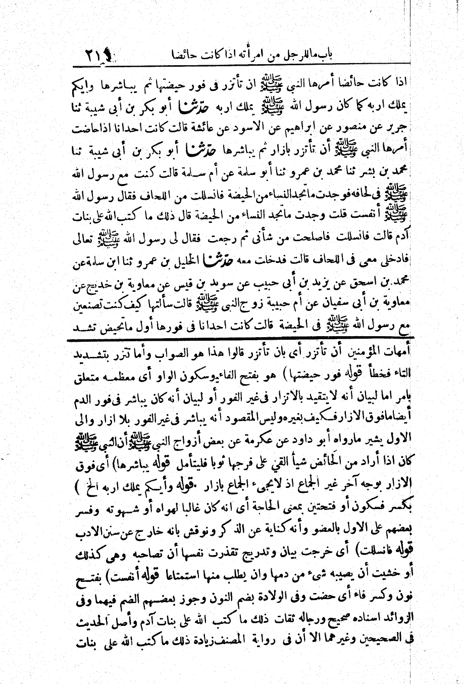 أُمَّهَاتِ الْمُؤْمِنِينَ أَنْ تَأْتَزِرَ أَيْ بِأَنْ تَأْتَزِرَ قَالُوا هَذَا هُوَ الصَّوَابُ وَأَمَّا تَتَّزِرُ بِتَشْدِيدِ التَّاءِ فَخَطَأٌ قَوْلُهُ (فَوْرَ حَيْضَتِهَا) هُوَ بِفَتْحِ الْفَاءِ وَسُكُونِ الْوَاوِ أَيْ مُعْظَمُهُ مُتَعَلِّقٌ بِأَمَرَ إِمَّا لِبَيَانِ أَنَّهُ لَا يَتَقَيَّدُ بِالِاتِّزَارِ فِي غَيْرِ الْفَوْرِ أَوْ لِبَيَانِ أَنَّهُ كَانَ يُبَاشِرُ فِي فَوْرِ الدَّمِ أَيْضًا مَا فَوْقَ الْإِزَارِ فَكَيْفَ بِغَيْرِهِ وَلَيْسَ الْمَقْصُودُ أَنَّهُ يُبَاشِرُ فِي غَيْرِ الْفَوْرِ بِلَا إِزَارٍ وَإِلَى الْأَوَّلِ يُشِيرُ مَا رَوَاهُ أَبُو دَاوُدَ عَنْ عِكْرِمَةَ عَنْ بَعْضِ أَزْوَاجِ النَّبِيِّ - صَلَّى اللَّهُ عَلَيْهِ وَسَلَّمَ - «أَنَّ النَّبِيَّ - صَلَّى اللَّهُ عَلَيْهِ وَسَلَّمَ - كَانَ إِذَا أَرَادَ مِنَ الْحَائِضِ شَيْئًا أَلْقَى عَلَى فَرْجِهَا ثَوْبًا» فَلْيُتَأَمَّلْ قَوْلُهُ (يُبَاشِرُهَا) أَيْ فَوْقَ الْإِزَارِ بِوَجْهٍ آخَرَ غَيْرَ الْجِمَاعِ إِذْ لَا يَجِيءُ الْجِمَاعُ بِإِزَارٍ قَوْلُهُ (وَأَيُّكُمْ يَمْلِكُ إِرَبَهُ إِلَخْ) بِكَسْرٍ فَسُكُونٍ أَوْ فَتْحَتَيْنِ بِمَعْنَى الْحَاجَةِ أَيْ إِنَّهُ كَانَ غَالِبًا لِهَوَاهُ أَوْ شَهْوَتِهِ وَفَسَّرَ بَعْضُهُمْ عَلَى الْأَوَّلِ بِالْعُضْوِ وَأَنَّهُ كِنَايَةٌ عَنِ الذَّكَرِ وَنُوقِشَ بِأَنَّهُ خَارِجٌ عَنْ سُنَنِ الْأَدَبِ.