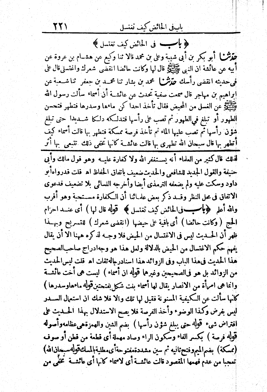 قَوْلُهُ (أَنَّ أَسْمَاءَ) لَيْسَتْ هِيَ أُخْتَ عَائِشَةَ وَإِنَّمَا هِيَ امْرَأَةٌ مِنَ الْأَنْصَارِ يُقَالُ لَهَا أَسْمَاءُ بِنْتُ شَكَلٍ بِفَتْحَتَيْنِ قَوْلُهُ (مَاءَهَا وَسِدْرَهَا) كَأَنَّهَا سَأَلَتْ عَنِ الْكَيْفِيَّةِ الْمَسْنُونَةِ فَقِيلَ لَهَا تِلْكَ وَإِلَّا فَلَا شَكَّ أَنَّ اسْتِعْمَالَ السِّدْرِ لَيْسَ بِفَرْضٍ وَكَذَا الْوُضُوءُ وَأَخْذُ الْفِرْصَةِ فَلَا يَصِحُّ الِاسْتِدْلَالُ بِهَذَا الْحَدِيثِ عَلَى افْتِرَاضِ شَيْءٍ قَوْلُهُ (حَتَّى يَبْلُغَ شُئُونَ رَأْسِهَا) بِضَمِّ الشِّينِ وَالْهَمْزَةِ هِيَ عِظَامُهُ وَأُصُولُهُ قَوْلُهُ (فِرْصَةٌ) بِكَسْرِ الْفَاءِ وَسُكُونِ الرَّاءِ وَصَادٍ مُهْمَلَةٍ أَيْ قِطْعَةٌ مِنْ قُطْنٍ أَوْ صُوفٍ (مُمَسَّكَةٌ) بِضَمِّ الْمِيمِ وَفَتْحِ ثَانِيهِ ثُمَّ سِينٍ مُشَدَّدَةٍ مَفْتُوحَةٍ أَيْ مَطْلِيَّةٌ بِالْمِسْكِ قَوْلُهُ (سُبْحَانَ اللَّهِ) تَعَجُّبًا مِنْ عَدَمِ فَهْمِهَا الْمَقْصُودَ قَالَتْ عَائِشَةُ أَيْ لِأَسْمَاءَ كَأَنَّهَا أَيْ عَائِشَةُ تُخْفِي مِنَ