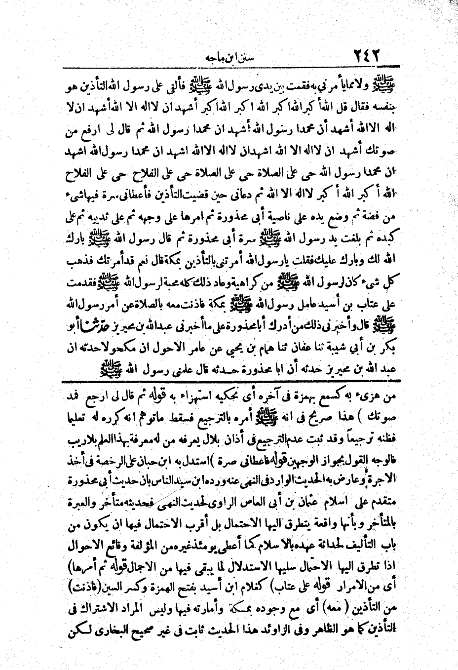 مِنْ هَزِئَ بِهِ كَسَمِعَ بِهَمْزَةٍ فِي آخِرِهِ أَيْ نَحْكِيهِ اسْتِهْزَاءً بِهِ قَوْلُهُ (ثُمَّ قَالَ لِي ارْجِعْ فَمُدَّ صَوْتَكَ) هَذَا صَرِيحٌ فِي أَنَّهُ - صَلَّى اللَّهُ عَلَيْهِ وَسَلَّمَ - أَمَرَهُ بِالتَّرْجِيعِ فَسَقَطَ مَا تُوَهِّمَ أَنَّهُ كَرَّرَهُ لَهُ تَعْلِيمًا فَظَنَّهُ تَرْجِيعًا وَقَدْ ثَبَتَ عَدَمُ التَّرْجِيعِ فِي أَذَانِ بِلَالٍ يَعْرِفُهُ مَنْ لَهُ مَعْرِفَةٌ بِهَذَا الْعِلْمِ بِلَا رَيْبٍ فَالْوَجْهُ الْقَوْلُ بِجَوَازِ الْوَجْهَيْنِ قَوْلُهُ (فَأَعْطَانِي صُرَّةً) اسْتَدَلَّ بِهِ ابْنُ حِبَّانَ عَلَى الرُّخْصَةِ فِي أَخْذِ الْأُجْرَةِ وَعَارَضَ بِهِ الْحَدِيثَ الْوَارِدَ فِي النَّهْيِ عَنْهُ وَرَدَّهُ ابْنُ سَيِّدِ النَّاسِ بِأَنَّ حَدِيثَ أَبِي مَحْذُورَةَ مُتَقَدِّمٌ عَلَى إِسْلَامِ عُثْمَانَ بْنِ أَبِي الْعَاصِ الرَّاوِي لِحَدِيثِ النَّهْيِ فَحَدِيثُهُ مُتَأَخِّرٌ وَالْعِبْرَةُ بِالْمُتَأَخِّرِ وَبِأَنَّهَا وَاقِعَةٌ يَتَطَرَّقُ إِلَيْهَا الِاحْتِمَالُ بَلْ أَقْرَبُ الِاحْتِمَالِ فِيهَا أَنْ يَكُونَ مِنْ بَابِ التَّأْلِيفِ لِحَدَاثَةِ عَهْدِهِ بِالْإِسْلَامِ كَمَا أَعْطَى يَوْمَئِذٍ غَيْرَهُ مِنَ الْمُؤَلَّفَةِ وَقَائِعُ الْأَحْوَالِ إِذَا تَطَرَّقَ إِلَيْهَا الِاحْتِمَالُ سَلَبَهَا الِاسْتِدْلَالُ لِمَا يَبْقَى فِيهَا مِنَ الْإِجْمَالِ قَوْلُهُ (ثُمَّ أَمَرَّهَا) أَيْ مِنَ الْإِمْرَارِ قَوْلُهُ (عَلَى عِتَابً) غُلَامِ ابْنِ أَسِيدٍ بِفَتْحِ الْهَمْزَةِ وَكَسْرِ السِّينِ (فَأَذَّنْتُ) مِنَ التَّأْذِينِ (مَعَهُ) أَيْ مَعَ وُجُودِهِ بِمَكَّةَ وَإِمَارَتَهُ فِيهَا وَلَيْسَ الْمُرَادُ الِاشْتِرَاكُ فِي التَّأْذِينِ كَمَا هُوَ الظَّاهِرُ وَفِي الزَّوَائِدِ هَذَا الْحَدِيثُ ثَابِتٌ فِي غَيْرِ صَحِيحِ الْبُخَارِيِّ لَكِنْ