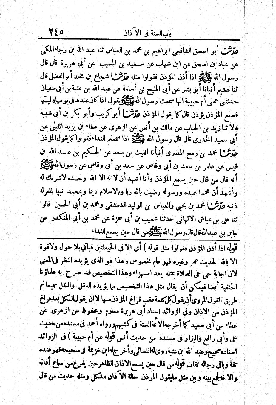قَوْلُهُ (إِذَا أَذَّنَ الْمُؤَذِّنُ فَقُولُوا مِثْلَ قَوْلِهِ) أَيْ إِلَّا فِي الْحَيْعَلَتَيْنِ فَيَأْتِي بِلَا حَوْلَ وَلَا قُوَّةَ إِلَّا بِاللَّهِ لِحَدِيثِ عُمَرَ وَغَيْرِهِ فَهُوَ عَامٌّ مَخْصُوصٌ وَهَذَا هُوَ الَّذِي يُؤَيِّدُهُ النَّظَرُ فِي الْمَعْنَى لِأَنَّ إِجَابَةَ حَيَّ عَلَى الصَّلَاةِ بِمِثْلِهِ يُعَدُّ اسْتِهْزَاءً وَهَذَا التَّخْصِيصُ قَدْ صَرَّحَ بِهِ عُلَمَاؤُنَا الْحَنَفِيَّةُ أَيْضًا فَيُمْكِنُ أَنْ يُقَالَ مِثْلُ هَذَا التَّخْصِيصِ مِمَّا يُؤَيِّدُهُ الْعَقْلُ وَالنَّقْلُ جَمِيعًا ثُمَّ طَرِيقُ الْقَوْلِ الْمَرْوِيِّ أَنْ يَقُولَ كُلَّ كَلِمَةٍ عَقِبَ فَرَاغِ الْمُؤَذِّنِ مِنْهَا لَا أَنْ يَقُولَ الْكُلَّ بَعْدَ فَرَاغِ الْمُؤَذِّنِ مِنَ الْأَذَانِ، وَفِي الزَّوَائِدِ إِسْنَادُ أَبِي هُرَيْرَةَ مَعْلُومٌ وَمَحْفُوظٌ عَنِ الزُّهْرِيِّ عَنْ عَطَاءٍ عَنْ أَبِي سَعِيدٍ كَمَا أَخْرَجَهُ الْأَئِمَّةُ السِّتَّةُ فِي كُتُبِهِمْ وَرَوَاهُ أَحْمَدُ فِي مُسْنَدِهِ مِنْ حَدِيثِ عَلِيٍّ وَأَبِي رَافِعٍ وَالْبَزَّارِ فِي مُسْنَدِهِ مِنْ حَدِيثِ أَنَسٍ.