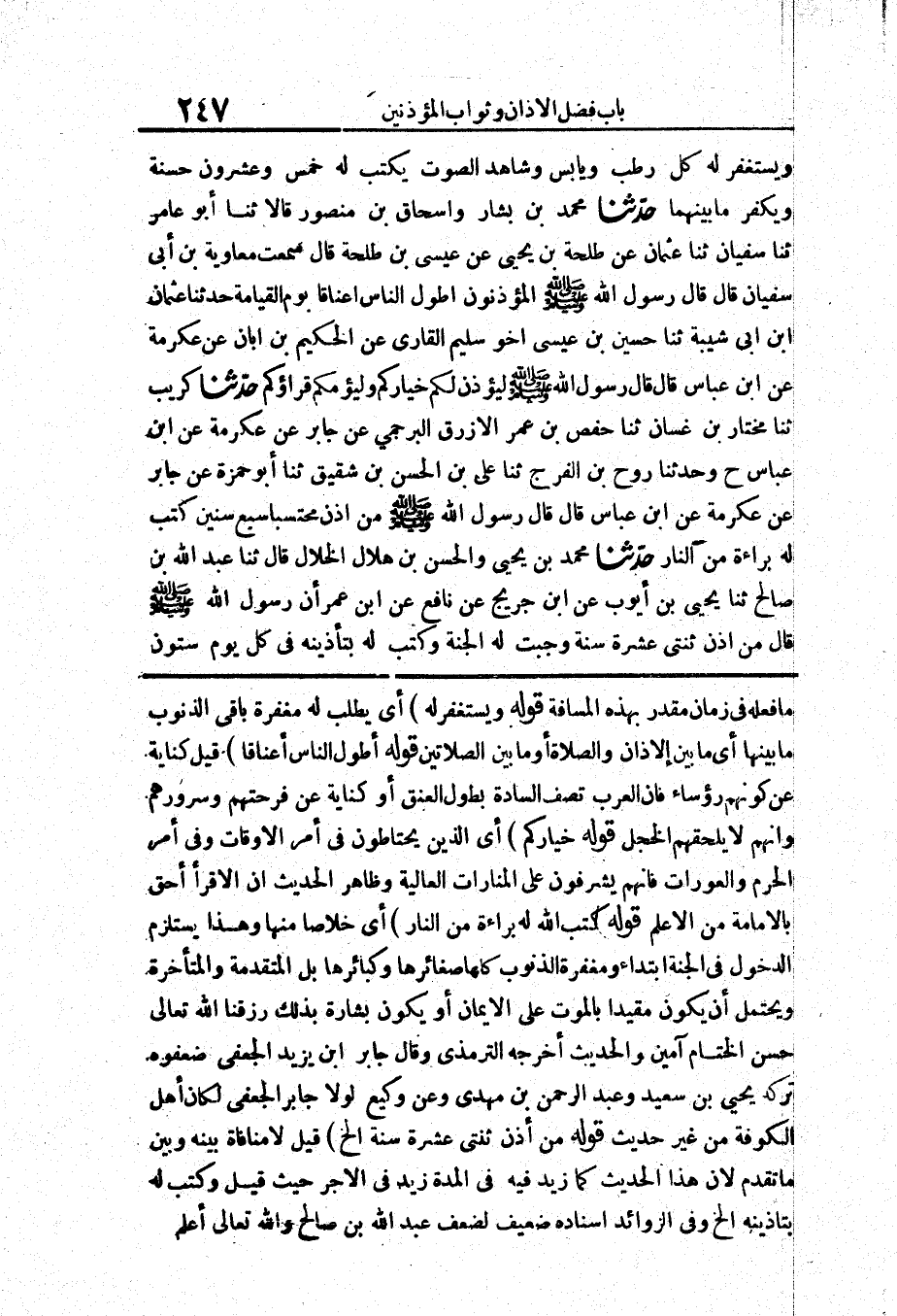 قَوْلُهُ (مَنْ أَذَّنَ ثِنْتَيْ عَشْرَةَ سَنَةً إِلَخْ) قِيلَ لَا مُنَافَاةَ بَيْنَهُ وَبَيْنَ مَا تَقَدَّمَ لِأَنَّ هَذَا الْحَدِيثَ كَمَا زِيدَ فِيهِ فِي الْمُدَّةِ زِيدَ فِي الْأَجْرِ حَيْثُ قِيلَ وَكُتِبَ لَهُ بِتَأْذِينِهِ إِلَخْ وَفِي الزَّوَائِدِ إِسْنَادُهُ ضَعِيفٌ لِضَعْفِ عَبْدِ اللَّهِ بْنِ صَالِحٍ وَاللَّهُ تَعَالَى أَعْلَمُ.