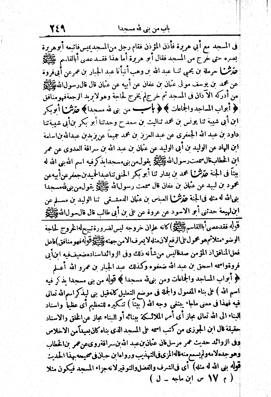 735 - حَدَّثَنَا أَبُو بَكْرِ بْنُ أَبِي شَيْبَةَ قَالَ حَدَّثَنَا يُونُسُ بْنُ مُحَمَّدٍ قَالَ حَدَّثَنَا لَيْثُ بْنُ سَعْدٍ ح وَحَدَّثَنَا أَبُو بَكْرِ بْنُ أَبِي شَيْبَةَ قَالَ حَدَّثَنَا دَاوُدُ بْنُ عَبْدِ اللَّهِ الْجَعْفَرِيُّ عَنْ عَبْدِ الْعَزِيزِ بْنِ مُحَمَّدٍ جَمِيعًا عَنْ يَزِيدَ بْنِ عَبْدِ اللَّهِ بْنِ أُسَامَةَ بْنِ الْهَادِ عَنْ الْوَلِيدِ بْنِ أَبِي الْوَلِيدِ عَنْ عُثْمَانَ بْنِ عَبْدِ اللَّهِ بْنِ سُرَاقَةَ الْعَدَوِيِّ عَنْ عُمَرَ بْنِ الْخَطَّابِ قَالَ «سَمِعْتُ رَسُولَ اللَّهِ صَلَّى اللَّهُ عَلَيْهِ وَسَلَّمَ يَقُولُ مَنْ بَنَى مَسْجِدًا يُذْكَرُ فِيهِ اسْمُ اللَّهِ بَنَى اللَّهُ لَهُ بَيْتًا فِي الْجَنَّةِ»