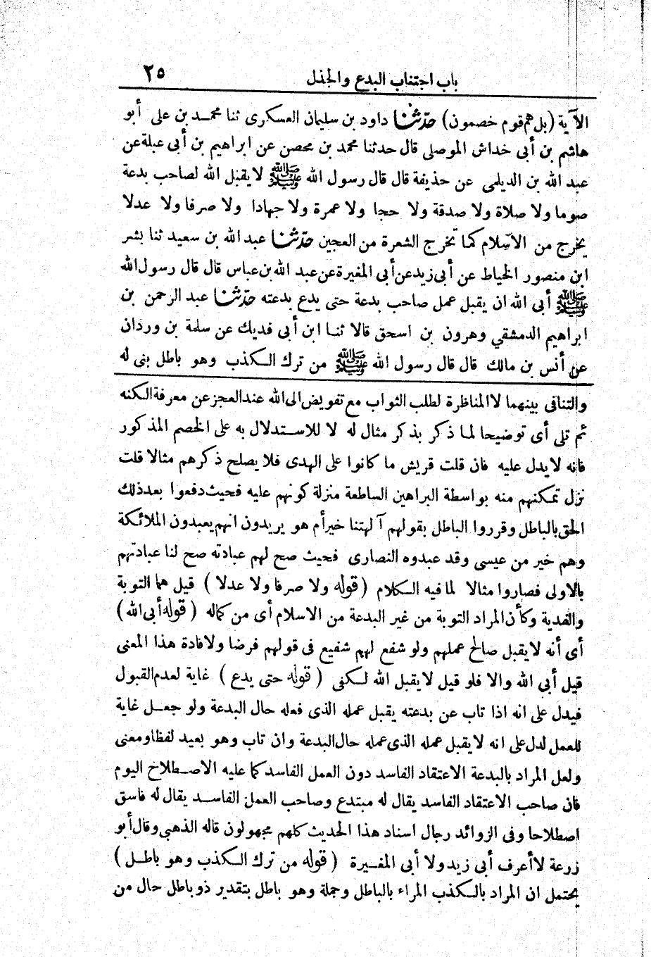 49 - حَدَّثَنَا دَاوُدُ بْنُ سُلَيْمَانَ الْعَسْكَرِيُّ حَدَّثَنَا مُحَمَّدُ بْنُ عَلِيٍّ أَبُو هَاشِمِ بْنِ أَبِي خِدَاشٍ الْمَوْصِلِيُّ قَالَ حَدَّثَنَا مُحَمَّدُ بْنُ مِحْصَنٍ عَنْ إِبْرَاهِيمَ بْنِ أَبِي عَبْلَةَ عَنْ عَبْدِ اللَّهِ بْنِ الدَّيْلَمِيِّ عَنْ حُذَيْفَةَ قَالَ «قَالَ رَسُولُ اللَّهِ صَلَّى اللَّهُ عَلَيْهِ وَسَلَّمَ لَا يَقْبَلُ اللَّهُ لِصَاحِبِ بِدْعَةٍ صَوْمًا وَلَا صَلَاةً وَلَا صَدَقَةً وَلَا حَجًّا وَلَا عُمْرَةً وَلَا جِهَادًا وَلَا صَرْفًا وَلَا عَدْلًا يَخْرُجُ مِنْ الْإِسْلَامِ كَمَا تَخْرُجُ الشَّعَرَةُ مِنْ الْعَجِينِ»