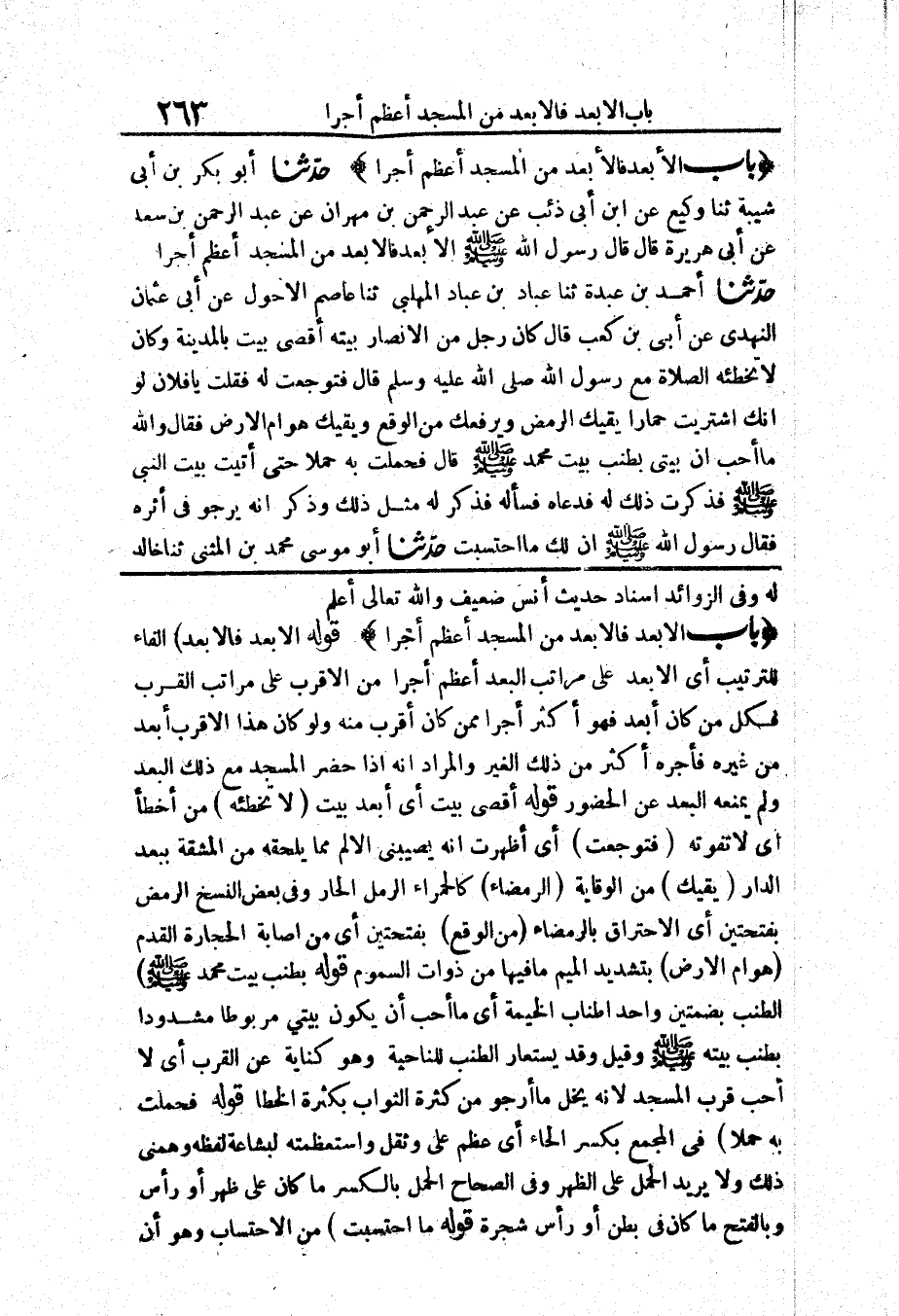 قَوْلُهُ (أَقْصَى بَيْتٍ) أَيْ أَبْعَدُ بَيْتٍ (لَا تُخْطِئُهُ) مِنْ أَخْطَأَ أَيْ لَا تَفُوتُهُ (فَتَوَجَّعَتْ) أَيْ أَظْهَرَتْ أَنَّهُ يُصِيبُنِي الْأَلَمُ مِمَّا يَلْحَقُهُ مِنَ الْمَشَقَّةِ بِبُعْدِ الدَّارِ (يَقِيكَ) مِنَ الْوِقَايَةِ (الرَّمْضَاءُ) كَالْحَمْرَاءِ الرَّمْلُ الْحَارُّ وَفِي بَعْضِ النُّسَخِ الرَّمَضُ بِفَتْحَتَيْنِ أَيِ الِاحْتِرَاقُ بِالرَّمْضَاءِ (مِنَ الْوَقَعِ) بِفَتْحَتَيْنِ أَيْ مِنْ إِصَابَةِ الْحِجَارَةِ الْقَدَمَ (هَوَامُّ الْأَرْضِ) بِتَشْدِيدِ الْمِيمِ مَا فِيهَا مِنْ ذَوَاتِ السُّمُومِ قَوْلُهُ (بِطُنُبِ بَيْتِ مُحَمَّدٍ - صَلَّى اللَّهُ عَلَيْهِ وَسَلَّمَ -) الطُّنُبُ بِضَمَّتَيْنِ وَاحِدُ إِطْنَابٍ الْخَيْمَةِ أَيْ مَا أُحِبُّ أَنْ يَكُونَ بَيْتِي مَرْبُوطًا مَشْدُودًا بِطُنُبِ بَيْتِهِ - صَلَّى اللَّهُ عَلَيْهِ وَسَلَّمَ - وَقِيلَ وَقَدْ يُسْتَعَارُ الطُّنُبُ لِلنَّاحِيَةِ وَهُوَ كِنَايَةٌ عَنِ الْقُرْبِ أَيْ لَا أُحِبُّ قُرْبَ الْمَسْجِدِ لِأَنَّهُ يَخْلُ مَا أَرْجُو مِنْ كَثْرَةِ الثَّوَابِ بِكَثْرَةِ الْخُطَا قَوْلُهُ (فَحَمَلْتُ بِهِ حِمْلًا) فِي الْمَجْمَعِ بِكَسْرِ الْحَاءِ أَيْ عَظُمَ عَلَيَّ وَثَقُلَ وَاسْتَعْظَمْتُهُ لِبَشَاعَةِ لَفْظِهِ وَهَمَّنِي ذَلِكَ وَلَا يُرِيدُ الْحَمْلَ عَلَى الظَّهْرِ وَفِي الصِّحَاحِ الْحِمْلُ بِالْكَسْرِ مَا كَانَ عَلَى ظَهْرٍ أَوْ رَأْسٍ وَبِالْفَتْحِ مَا كَانَ فِي بَطْنٍ أَوْ رَأْسِ شَجَرَةٍ قَوْلُهُ (مَا احْتَسَبْتُ) مِنَ الِاحْتِسَابِ وَهُوَ أَنْ