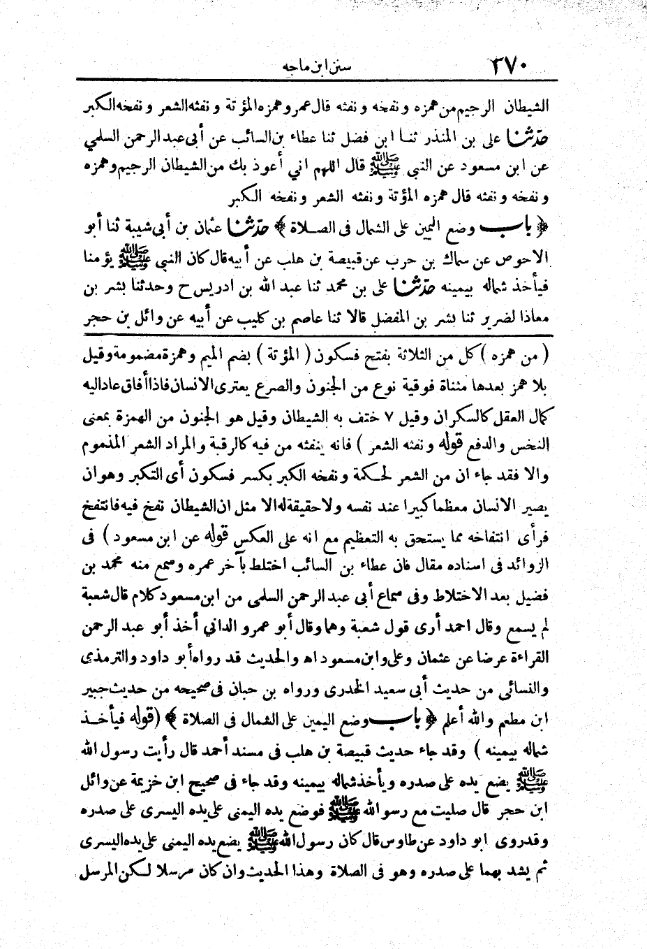 808 - حَدَّثَنَا عَلِيُّ بْنُ الْمُنْذِرِ حَدَّثَنَا ابْنُ فُضَيْلٍ حَدَّثَنَا عَطَاءُ بْنُ السَّائِبِ عَنْ أَبِي عَبْدِ الرَّحْمَنِ السُّلَمِيِّ عَنْ ابْنِ مَسْعُودٍ «عَنْ النَّبِيِّ صَلَّى اللَّهُ عَلَيْهِ وَسَلَّمَ قَالَ اللَّهُمَّ إِنِّي أَعُوذُ بِكَ مِنْ الشَّيْطَانِ الرَّجِيمِ وَهَمْزِهِ وَنَفْخِهِ وَنَفْثِهِ قَالَ هَمْزُهُ الْمُوتَةُ وَنَفْثُهُ الشِّعْرُ وَنَفْخُهُ الْكِبْرُ»