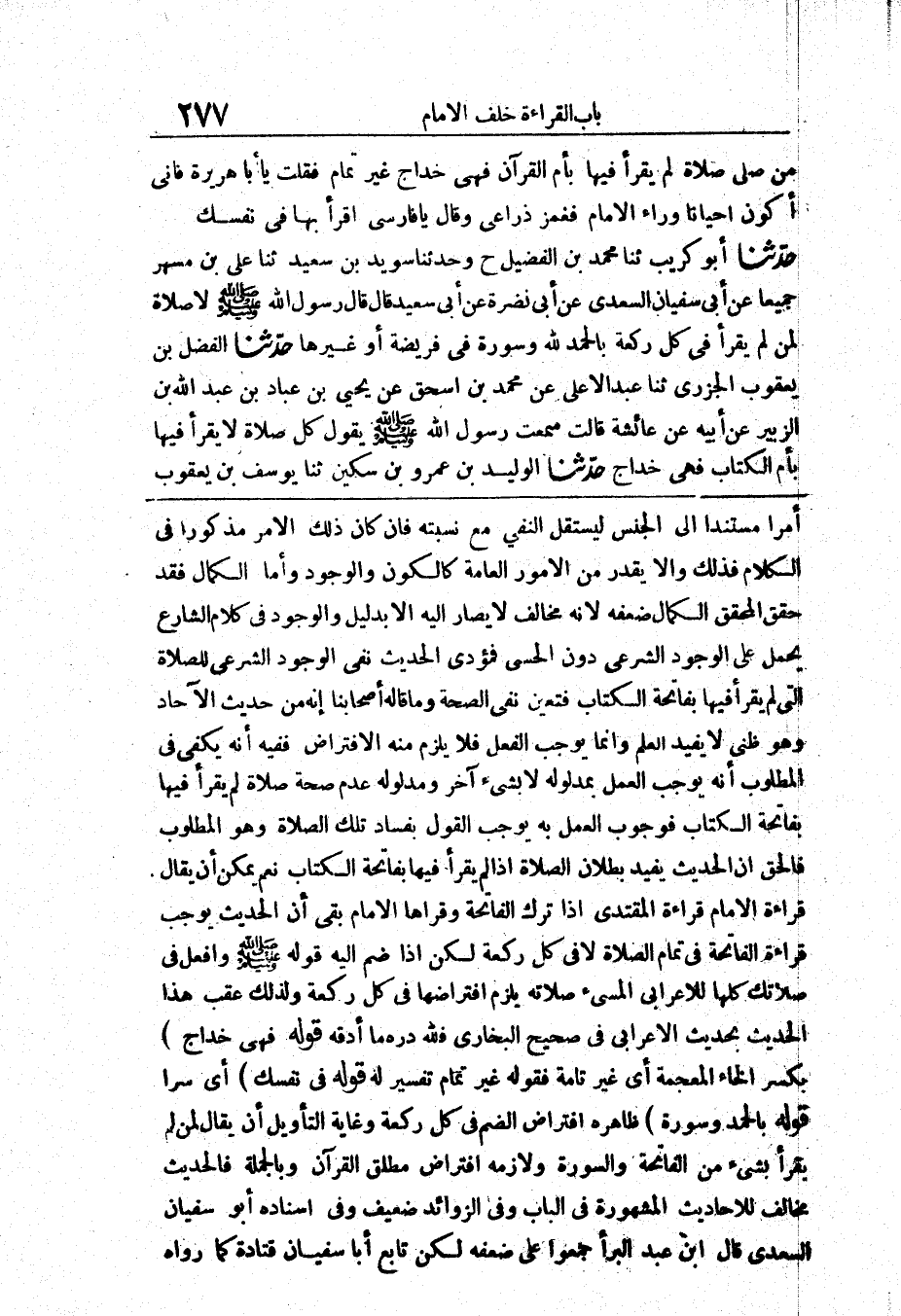 أَمْرًا مُسْتَنِدًا إِلَى الْجِنْسِ لِيَسْتَقِلَّ النَّفْيَ مَعَ نِسْبَتِهِ فَإِنْ كَانَ ذَلِكَ الْأَمْرُ مَذْكُورًا فِي الْكَلَامِ فَذَلِكَ وَإِلَّا يُقَدَّرُ مِنَ الْأُمُورِ الْعَامَّةِ كَالْكَوْنِ وَالْوُجُودِ وَأَمَّا الْكَمَالُ فَقَدْ حَقَّقَ الْمُحَقِّقُ الْكَمَالَ ضَعْفَهُ لِأَنَّهُ مُخَالِفٌ لَا يُصَارُ إِلَيْهِ إِلَّا بِدَلِيلٍ وَالْوُجُودُ فِي كَلَامِ الشَّارِعِ يُحْمَلُ عَلَى الْوُجُودِ الشَّرْعِيِّ دُونَ الْحِسِّيِّ فَمُؤَدَّى الْحَدِيثِ نَفْيُ الْوُجُودِ الشَّرْعِيِّ لِلصَّلَاةِ الَّتِي لَمْ يُقْرَأْ فِيهَا بِفَاتِحَةِ الْكِتَابِ فَتَعَيَّنَ نَفْيُ الصِّحَّةِ وَمَا قَالَهُ أَصْحَابُنَا أَنَّهُ مِنْ حَدِيثِ الْآحَادِ وَهُوَ ظَنِّيٌّ لَا يُفِيدُ الْعِلْمَ وَإِنَّمَا يُوجِبُ الْفِعْلَ فَلَا يَلْزَمُ مِنْهُ الِافْتِرَاضُ فَفِيهِ أَنَّهُ يَكْفِي فِي الْمَطْلُوبِ أَنَّهُ يُوجِبُ الْعَمَلَ بِمَدْلُولِهِ لَا بِشَيْءٍ آخَرَ وَمَدْلُولُهُ عَدَمُ صِحَّةِ صَلَاةٍ لَمْ يُقْرَأْ فِيهَا بِفَاتِحَةِ الْكِتَابِ فَوُجُوبُ الْعَمَلِ بِهِ يُوجِبُ الْقَوْلَ بِفَسَادِ تِلْكَ الصَّلَاةِ وَهُوَ الْمَطْلُوبُ، فَالْحَقُّ أَنَّ الْحَدِيثَ يُفِيدُ بُطْلَانَ الصَّلَاةِ إِذَا لَمْ يُقْرَأْ فِيهَا بِفَاتِحَةِ الْكِتَابِ نَعَمْ يُمْكِنُ أَنْ يُقَالَ قِرَاءَةُ الْإِمَامِ قِرَاءَةُ الْمُقْتَدِي إِذَا تَرَكَ الْفَاتِحَةَ وَقَرَأَهَا الْإِمَامُ بَقِيَ أَنَّ الْحَدِيثَ يُوجِبُ قِرَاءَةَ الْفَاتِحَةِ فِي تَمَامِ الصَّلَاةِ لَا فِي كُلِّ رَكْعَةٍ لَكِنْ إِذَا ضُمَّ إِلَيْهِ «قَوْلُهُ - صَلَّى اللَّهُ عَلَيْهِ وَسَلَّمَ - وَافْعَلْ فِي صَلَاتِكَ كُلِّهَا لِلْأَعْرَابِيِّ الْمُسِيءِ صَلَاتَهُ» يَلْزَمُ افْتِرَاضُهَا فِي كُلِّ رَكْعَةٍ وَلِذَلِكَ عَقَّبَ هَذَا الْحَدِيثَ بِحَدِيثِ الْأَعْرَابِيِّ فِي صَحِيحِ الْبُخَارِيِّ فَلِلَّهِ دَرُّهُ مَا أَدَقَّهُ.