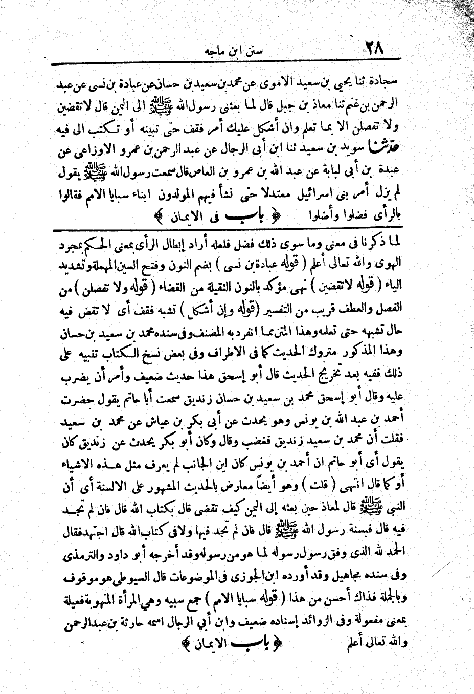 (قُلْتُ) وَهُوَ أَيْضًا مُعَارَضٌ بِالْحَدِيثِ الْمَشْهُورِ عَلَى الْأَلْسِنَةِ أَيْ «أَنَّ النَّبِيَّ ـ صَلَّى اللَّهُ عَلَيْهِ وَسَلَّمَ ـ قَالَ لِمُعَاذٍ حِينَ بَعَثَهُ إِلَى الْيَمَنِ كَيْفَ تَقْضِي قَالَ: بِكِتَابِ اللَّهِ قَالَ فَإِنْ لَمْ تَجِدْ فِيهِ قَالَ: فَبِسُنَّةِ رَسُولِ اللَّهِ ـ صَلَّى اللَّهُ عَلَيْهِ وَسَلَّمَ ـ قَالَ: فَإِنْ لَمْ تَجِدْ فِيهَا وَلَا فِي كِتَابِ اللَّهِ قَالَ: أَجْتَهِدُ فَقَالَ: الْحَمْدُ لِلَّهِ الَّذِي وَفَّقَ رَسُولَ رَسُولِهِ لِمَا هُوَ مِنْ رَسُولِهِ» وَقَدْ أَخْرَجَهُ أَبُو دَاوُدَ وَالتِّرْمِذِيُّ وَفِي سَنَدِهِ مَجَاهِيلُ وَقَدْ أَوْرَدَهُ ابْنُ الْجَوْزِيِّ فِي الْمَوْضُوعَاتِ قَالَ السُّيُوطِيُّ هُوَ مَوْقُوفٌ وَبِالْجُمْلَةِ فَذَاكَ أَحْسَنُ مِنْ هَذَا.