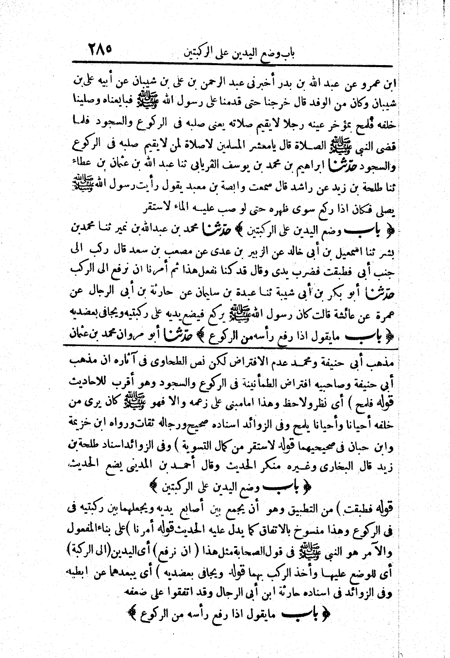 873 - حَدَّثَنَا مُحَمَّدُ بْنُ عَبْدِ اللَّهِ بْنِ نُمَيْرٍ قَالَ حَدَّثَنَا مُحَمَّدُ بْنُ بِشْرٍ حَدَّثَنَا إِسْمَعِيلُ بْنُ أَبِي خَالِدٍ عَنْ الزُّبَيْرِ بْنِ عَدِيٍّ عَنْ مُصْعَبِ بْنِ سَعْدٍ قَالَ «رَكَعْتُ إِلَى جَنْبِ أَبِي فَطَبَّقْتُ فَضَرَبَ يَدِي وَقَالَ قَدْ كُنَّا نَفْعَلُ هَذَا ثُمَّ أُمِرْنَا أَنْ نَرْفَعَ إِلَى الرُّكَبِ»