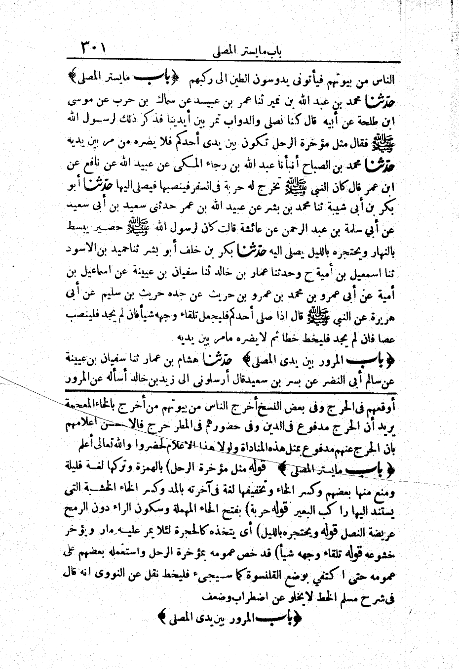 940 - حَدَّثَنَا مُحَمَّدُ بْنُ عَبْدِ اللَّهِ بْنِ نُمَيْرٍ حَدَّثَنَا عُمَرُ بْنُ عُبَيْدٍ عَنْ سِمَاكِ بْنِ حَرْبٍ عَنْ مُوسَى بْنِ طَلْحَةَ عَنْ أَبِيهِ قَالَ «كُنَّا نُصَلِّي وَالدَّوَابُّ تَمُرُّ بَيْنَ أَيْدِينَا فَذُكِرَ ذَلِكَ لِرَسُولِ اللَّهِ صَلَّى اللَّهُ عَلَيْهِ وَسَلَّمَ فَقَالَ مِثْلُ مُؤَخِّرَةِ الرَّحْلِ تَكُونُ بَيْنَ يَدَيْ أَحَدِكُمْ فَلَا يَضُرُّهُ مَنْ مَرَّ بَيْنَ يَدَيْهِ»