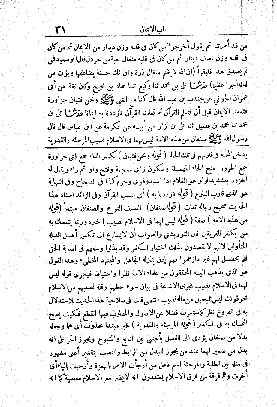 قُلْتُ فِي صَلَاحِيَّةِ هَذَا الْحَدِيثِ لِلِاسْتِدْلَالِ بِهِ فِي الْفُرُوعِ نَظَرٌ كَمَا سَتَعْرِفُ فَضْلًا عَنِ الْأُصُولِ وَالْمَطْلُوبُ فِيهَا الْقَطْعُ فَكَيْفَ يَصِحُّ التَّمَسُّكُ بِهِ فِي التَّكْفِيرِ قَوْلُهُ: (الْمُرْجِئَةُ وَالْقَدَرِيَّةُ) خَبَرُ مُبْتَدَأٍ مَحْذُوفٍ أَيْ هُمَا وَجَعْلُهُ بَدَلًا مِنْ صِنْفَانِ يُؤَدِّي إِلَى الْفَصْلِ بِأَجْنَبِيٍّ بَيْنَ التَّابِعِ وَالْمَتْبُوعِ وَيَجُوزُ الْجَرُّ عَلَى أَنَّهُ بَدَلٌ مِنْ ضَمِيرٍ لَهُمَا عِنْدَ مَنْ يُجَوِّزُ الْبَدَلَ مِنَ الرَّابِطِ وَالنَّصْبُ بِتَقْدِيرِ أَعْنِي مَشْهُورٌ فِي مِثْلِهِ بَيْنَ الطَّلَبَةِ