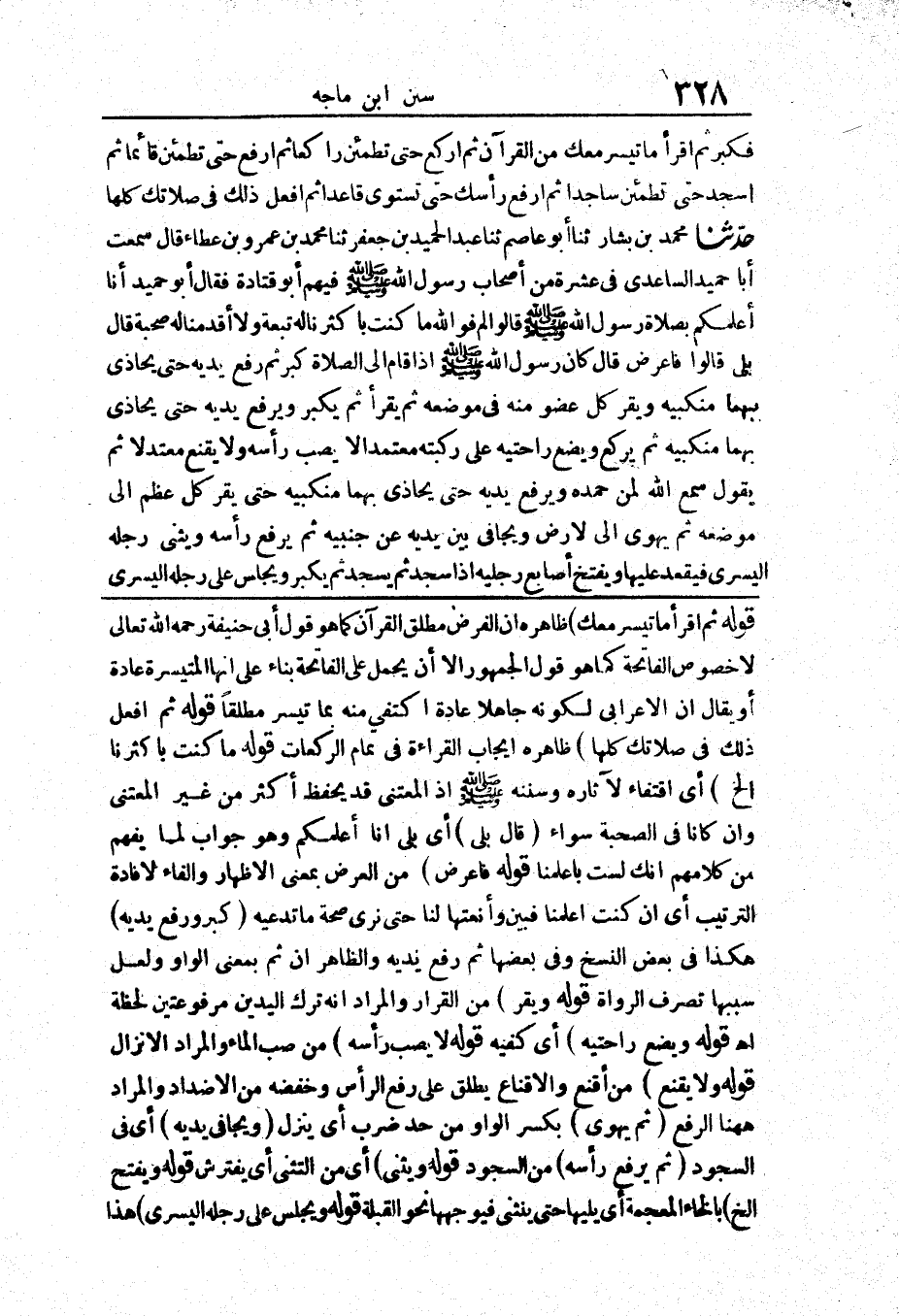 قَوْلُهُ (مَا كُنْتَ بِأَكْثَرِنَا إِلَخْ) أَيِ اقْتِفَاءً لِآثَارِهِ وَسُنَنِهِ - صَلَّى اللَّهُ عَلَيْهِ وَسَلَّمَ - إِذِ الْمُعْتَنِي قَدْ يَحْفَظُ أَكْثَرَ مِنْ غَيْرِ الْمُعْتَنِي وَإِنْ كَانَا فِي الصُّحْبَةِ سَوَاءً (قَالَ بَلَى) أَيْ بَلَى أَنَا أُعَلِّمُكُمْ وَهُوَ جَوَابٌ لِمَا يُفْهَمُ مِنْ كَلَامِهِمْ إِنَّكَ لَسْتَ بِأَعْلَمِنَا قَوْلُهُ (فَاعْرِضْ) مِنَ الْعَرْضِ بِمَعْنَى الْإِظْهَارِ وَالْفَاءُ لِإِفَادَةِ التَّرْتِيبِ أَيْ إِنْ كُنْتَ أَعْلَمَنَا فَبَيِّنْ وَأَنْعِتْهَا لَنَا حَتَّى نَرَى صِحَّةَ مَا تَدَّعِيهِ (كَبَّرَ وَرَفَعَ يَدَيْهِ) هَكَذَا فِي بَعْضِ النُّسَخِ وَفِي بَعْضِهَا ثُمَّ رَفَعَ يَدَيْهِ وَالظَّاهِرُ أَنَّ ثُمَّ بِمَعْنَى الْوَاوِ وَلَعَلَّ سَبَبَهَا تَعَرُّفُ الرُّوَاةِ قَوْلُهُ (وَيَقَرُّ) مِنَ الْقَرَارِ وَالْمُرَادُ أَنَّهُ تَرَكَ الْيَدَيْنِ مَرْفُوعَتَيْنِ لَحْظَةً اهـ قَوْلُهُ (وَيَضَعُ رَاحَتَيْهِ) أَيْ كَفَّيْهِ قَوْلُهُ (لَا يَصُبُّ رَأْسَهُ) مِنْ صَبَّ الْمَاءَ وَالْمُرَادُ الْإِنْزَالُ قَوْلُهُ (وَلَا يُقْنِعُ) مِنْ أَقْنَعَ وَالْإِقْنَاعُ يُطْلَقُ عَلَى رَفْعِ الرَّأْسِ وَخَفْضِهِ مِنَ الْأَضْدَادِ وَالْمُرَادُ هَاهُنَا الرَّفْعُ (ثُمَّ يَهْوِي) بِكَسْرِ الْوَاوِ مِنْ حَدِّ ضَرَبَ أَيْ يُنْزِلُ (وَيُجَافِي يَدَيْهِ) أَيْ فِي السُّجُودِ (ثُمَّ يَرْفَعُ رَأْسَهُ) مِنَ السُّجُودِ قَوْلُهُ (وَيُثْنِي) أَيْ مِنَ التَّثَنِّي أَيْ يَفْتَرِشُ قَوْلُهُ (وَيَفْتَخُ إِلَخْ) بِالْخَاءِ الْمُعْجَمَةِ أَيْ يَلِيهَا حَتَّى يَنْثَنِي فَيُوَجِّهُهَا نَحْوَ الْقِبْلَةِ قَوْلُهُ (وَيَجْلِسُ عَلَى رِجْلِهِ الْيُسْرَى) هَذَا
