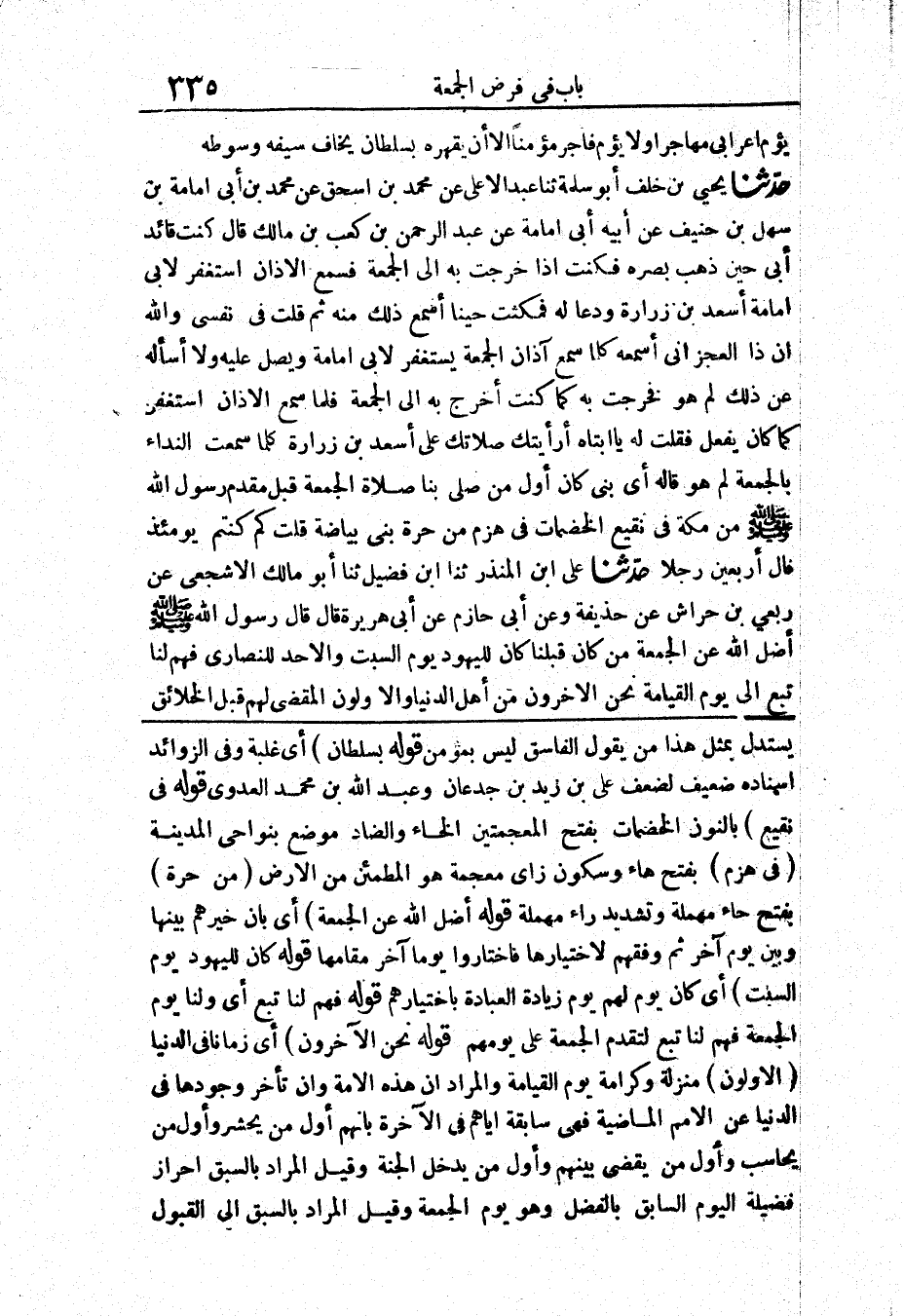 1082 - حَدَّثَنَا يَحْيَى بْنُ خَلَفٍ أَبُو سَلَمَةَ حَدَّثَنَا عَبْدُ الْأَعْلَى عَنْ مُحَمَّدِ بْنِ إِسْحَقَ عَنْ مُحَمَّدِ بْنِ أَبِي أُمَامَةَ بْنِ سَهْلِ بْنِ حُنَيْفٍ عَنْ أَبِيهِ أَبِي أُمَامَةَ عَنْ عَبْدِ الرَّحْمَنِ بْنِ كَعْبِ بْنِ مَالِكٍ قَالَ كُنْتُ قَائِدَ أَبِي حِينَ ذَهَبَ بَصَرُهُ فَكُنْتُ إِذَا خَرَجْتُ بِهِ إِلَى الْجُمُعَةِ فَسَمِعَ الْأَذَانَ اسْتَغْفَرَ لِأَبِي أُمَامَةَ أَسْعَدَ بْنِ زُرَارَةَ وَدَعَا لَهُ فَمَكَثْتُ حِينًا أَسْمَعُ ذَلِكَ مِنْهُ ثُمَّ قُلْتُ فِي نَفْسِي وَاللَّهِ إِنَّ ذَا لَعَجْزٌ إِنِّي أَسْمَعُهُ كُلَّمَا سَمِعَ أَذَانَ الْجُمُعَةِ يَسْتَغْفِرُ لِأَبِي أُمَامَةَ وَيُصَلِّي عَلَيْهِ وَلَا أَسْأَلُهُ عَنْ ذَلِكَ لِمَ هُوَ فَخَرَجْتُ بِهِ كَمَا كُنْتُ أَخْرُجُ بِهِ إِلَى الْجُمُعَةِ فَلَمَّا سَمِعَ الْأَذَانَ اسْتَغْفَرَ كَمَا كَانَ يَفْعَلُ فَقُلْتُ لَهُ يَا أَبَتَاهُ أَرَأَيْتَكَ صَلَاتَكَ عَلَى أَسْعَدَ بْنِ زُرَارَةَ كُلَّمَا سَمِعْتَ النِّدَاءَ بِالْجُمُعَةِ لِمَ هُوَ قَالَ أَيْ بُنَيَّ كَانَ أَوَّلَ مَنْ صَلَّى بِنَا صَلَاةَ الْجُمُعَةِ قَبْلَ مَقْدَمِ رَسُولِ اللَّهِ صَلَّى اللَّهُ عَلَيْهِ وَسَلَّمَ مِنْ مَكَّةَ فِي نَقِيعِ الْخَضَمَاتِ فِي هَزْمٍ مِنْ حَرَّةِ بَنِي بَيَاضَةَ قُلْتُ كَمْ كُنْتُمْ يَوْمَئِذٍ قَالَ أَرْبَعِينَ رَجُلًا