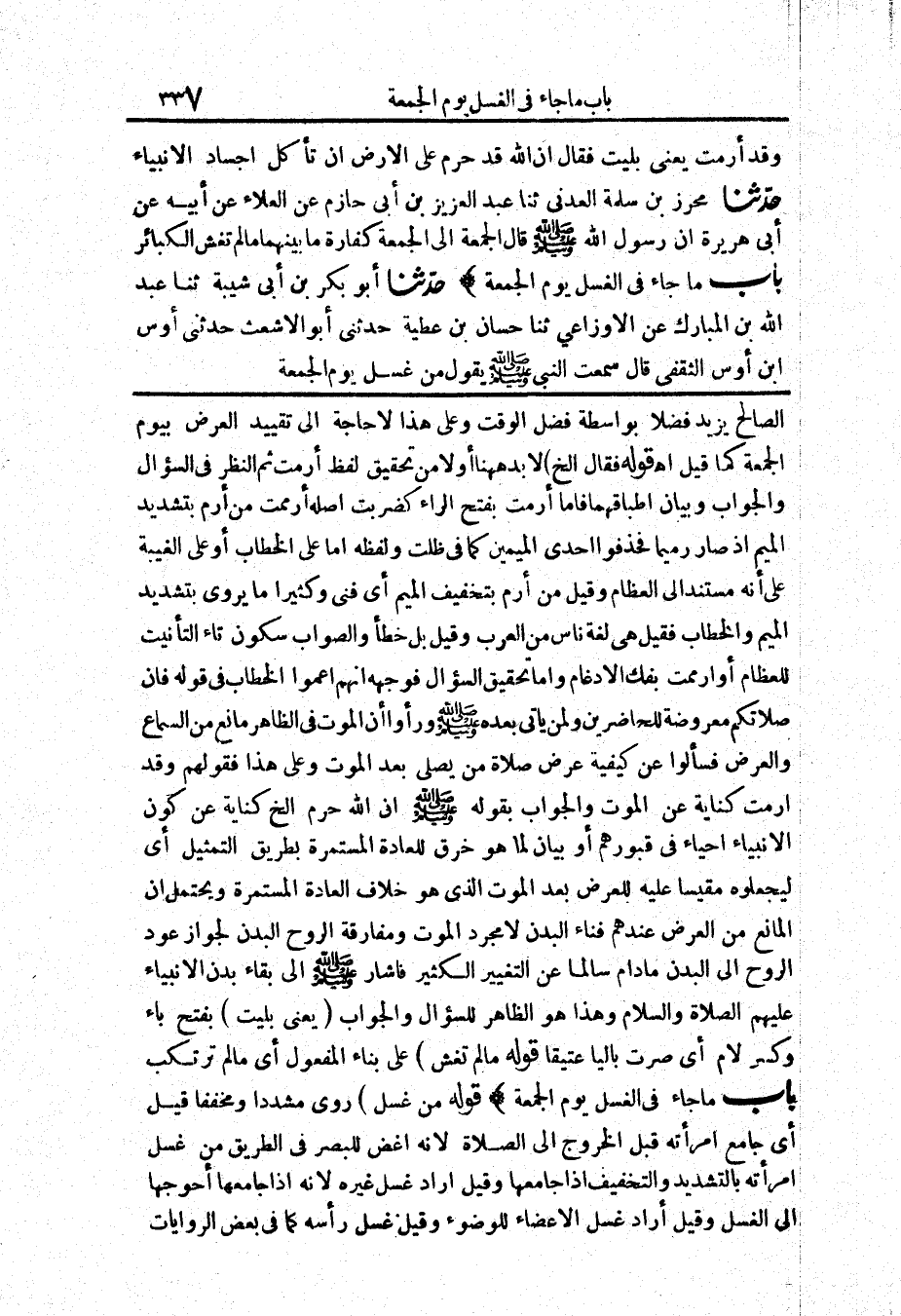 الصَّالِحَ يَزِيدُ فَضْلًا بِوَاسِطَةِ فَضْلِ الْوَقْتِ وَعَلَى هَذَا لَا حَاجَةَ إِلَى تَقْيِيدِ الْعَرْضِ بِيَوْمِ الْجُمُعَةِ كَمَا قِيلَ اهـ قَوْلُهُ (فَقَالَ إِلَخْ) لَا بُدَّ هَاهُنَا أَوَّلًا مِنْ تَحْقِيقِ لَفْظِ أَرَمْتُ ثُمَّ النَّظَرُ فِي السُّؤَالِ وَالْجَوَابِ وَبَيَانُ إِطْبَاقِهِمَا فَأَمَّا أَرَمْتُ بِفَتْحِ الرَّاءِ كَضَرَبْتُ أَصْلُهُ أَرْمَمْتُ مِنْ أَرَمَّ بِتَشْدِيدِ الْمِيمِ إِذْ صَارَ رَمِيمًا فَحَذَفُوا إِحْدَى الْمِيمَيْنِ كَمَا فِي ظَلَّتْ وَلَفْظُهُ إِمَّا عَلَى الْخِطَابِ أَوْ عَلَى الْغَيْبَةِ عَلَى أَنَّهُ مُسْتَنِدٌ إِلَى الْعِظَامِ وَقِيلَ مِنْ أَرَمَ بِتَخْفِيفِ الْمِيمِ أَيْ فَنِيَ وَكَثِيرًا مَا يُرْوَى بِتَشْدِيدِ الْمِيمِ وَالْخِطَابِ فَقِيلَ هِيَ لُغَةُ نَاسٍ مِنَ الْعَرَبِ وَقِيلَ بَلْ خَطَأٌ وَالصَّوَابُ سُكُونُ تَاءِ التَّأْنِيثِ لِلْعِظَامِ أَوْ أَرْمَمْتُ بِفَكِّ الْإِدْغَامِ وَأَمَّا تَحْقِيقُ السُّؤَالِ فَوَجْهُهُ أَنَّهُمْ أَعَمُّوا الْخِطَابَ فِي قَوْلِهِ: " فَإِنَّ صَلَاتَكُمْ مَعْرُوضَةٌ " لِلْحَاضِرِينَ وَلِمَنْ يَأْتِي بَعْدَهُ - صَلَّى اللَّهُ عَلَيْهِ وَسَلَّمَ - وَرَأَوْا أَنَّ الْمَوْتَ فِي الظَّاهِرِ مَانِعٌ مِنَ السَّمَاعِ وَالْعَرْضِ فَسَأَلُوا عَنْ كَيْفِيَّةِ عَرْضِ صَلَاةِ مَنْ يُصَلِّي بَعْدَ الْمَوْتِ وَعَلَى هَذَا فَقَوْلُهُمْ وَقَدْ أَرَمَّتْ كِنَايَةٌ عَنِ الْمَوْتِ وَالْجَوَابُ بِقَوْلِهِ - صَلَّى اللَّهُ عَلَيْهِ وَسَلَّمَ - إِنَّ اللَّهَ حَرَّمَ إِلَخْ كِنَايَةٌ عَنْ كَوْنِ الْأَنْبِيَاءِ أَحْيَاءَ فِي قُبُورِهِمْ أَوْ بَيَانٌ لِمَا هُوَ خَرْقٌ لِلْعَادَةِ الْمُسْتَمِرَّةِ بِطَرِيقِ التَّمْثِيلِ أَيْ لِيَجْعَلُوهُ مَقِيسًا عَلَيْهِ لِلْعَرْضِ بَعْدَ الْمَوْتِ الَّذِي هُوَ خِلَافُ الْعَادَةِ الْمُسْتَمِرَّةِ وَيُحْتَمَلُ أَنَّ الْمَانِعَ مِنَ الْعَرْضِ عِنْدَهُمْ فِنَاءُ الْبَدَنِ لَا مُجَرَّدُ الْمَوْتِ وَمُفَارَقَةُ الرُّوحِ الْبَدَنَ لِجَوَازِ عَوْدِ الرُّوحِ إِلَى الْبَدَنِ مَا دَامَ سَالِمًا عَنِ التَّغْيِيرِ الْكَثِيرِ فَأَشَارَ - صَلَّى اللَّهُ عَلَيْهِ وَسَلَّمَ - إِلَى بَقَاءِ بَدَنِ الْأَنْبِيَاءِ عَلَيْهِمُ الصَّلَاةُ وَالسَّلَامُ وَهَذَا هُوَ الظَّاهِرُ لِلسُّؤَالِ وَالْجَوَابِ (يَعْنِي بَلِيَتْ) بِفَتْحِ بَاءٍ وَكَسْرِ لَامٍ أَيْ صِرْتُ بَالِيًا عَتِيقًا.
