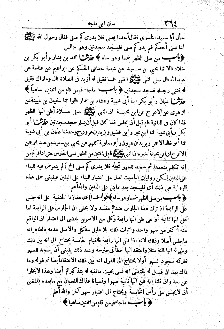1206 - حَدَّثَنَا عُثْمَانُ وَأَبُو بَكْرٍ ابْنَا أَبِي شَيْبَةَ وَهِشَامُ بْنُ عَمَّارٍ قَالُوا حَدَّثَنَا سُفْيَانُ بْنُ عُيَيْنَةَ عَنْ الزُّهْرِيِّ عَنْ الْأَعْرَجِ عَنْ ابْنِ بُحَيْنَةَ «أَنَّ النَّبِيَّ صَلَّى اللَّهُ عَلَيْهِ وَسَلَّمَ صَلَّى صَلَاةً أَظُنُّ أَنَّهَا الظُّهْرُ فَلَمَّا كَانَ فِي الثَّانِيَةِ قَامَ قَبْلَ أَنْ يَجْلِسَ فَلَمَّا كَانَ قَبْلَ أَنْ يُسَلِّمَ سَجَدَ سَجْدَتَيْنِ»