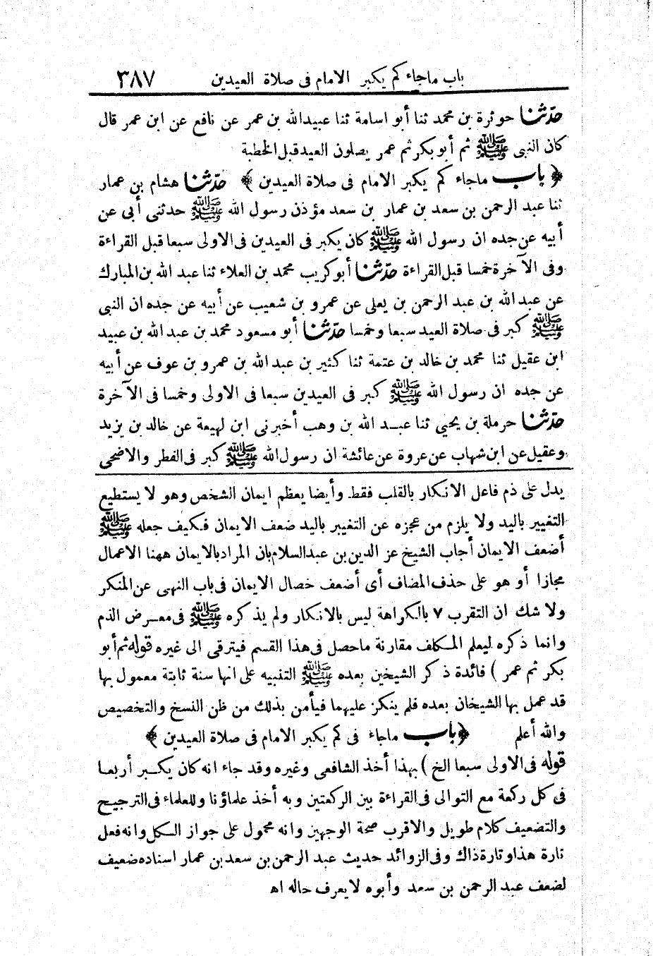 1278 - حَدَّثَنَا أَبُو كُرَيْبٍ مُحَمَّدُ بْنُ الْعَلَاءِ حَدَّثَنَا عَبْدُ اللَّهِ بْنُ الْمُبَارَكِ عَنْ عَبْدِ اللَّهِ بْنِ عَبْدِ الرَّحْمَنِ بْنِ يَعْلَى عَنْ عَمْرِو بْنِ شُعَيْبٍ عَنْ أَبِيهِ عَنْ جَدِّهِ «أَنَّ النَّبِيَّ صَلَّى اللَّهُ عَلَيْهِ وَسَلَّمَ كَبَّرَ فِي صَلَاةِ الْعِيدَيْنِ سَبْعًا وَخَمْسًا»