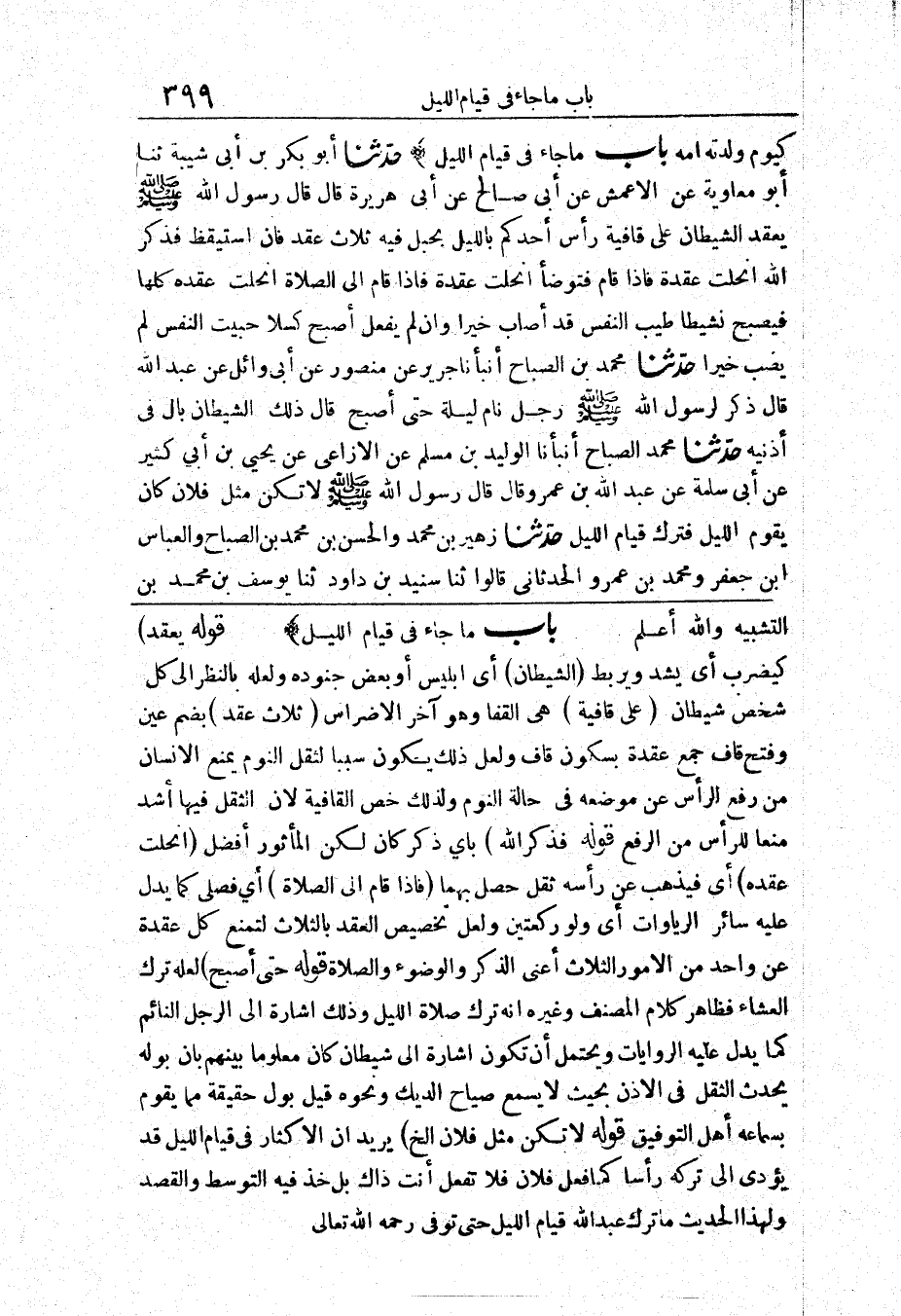 1329 - حَدَّثَنَا أَبُو بَكْرِ بْنُ أَبِي شَيْبَةَ حَدَّثَنَا أَبُو مُعَاوِيَةَ عَنْ الْأَعْمَشِ عَنْ أَبِي صَالِحٍ عَنْ أَبِي هُرَيْرَةَ قَالَ «قَالَ رَسُولُ اللَّهِ صَلَّى اللَّهُ عَلَيْهِ وَسَلَّمَ يَعْقِدُ الشَّيْطَانُ عَلَى قَافِيَةِ رَأْسِ أَحَدِكُمْ بِاللَّيْلِ بِحَبْلٍ فِيهِ ثَلَاثُ عُقَدٍ فَإِنْ اسْتَيْقَظَ فَذَكَرَ اللَّهَ انْحَلَّتْ عُقْدَةٌ فَإِذَا قَامَ فَتَوَضَّأَ انْحَلَّتْ عُقْدَةٌ فَإِذَا قَامَ إِلَى الصَّلَاةِ انْحَلَّتْ عُقَدُهُ كُلُّهَا فَيُصْبِحُ نَشِيطًا طَيِّبَ النَّفْسِ قَدْ أَصَابَ خَيْرًا وَإِنْ لَمْ يَفْعَلْ أَصْبَحَ كَسِلًا خَبِيثَ النَّفْسِ لَمْ يُصِبْ خَيْرًا»