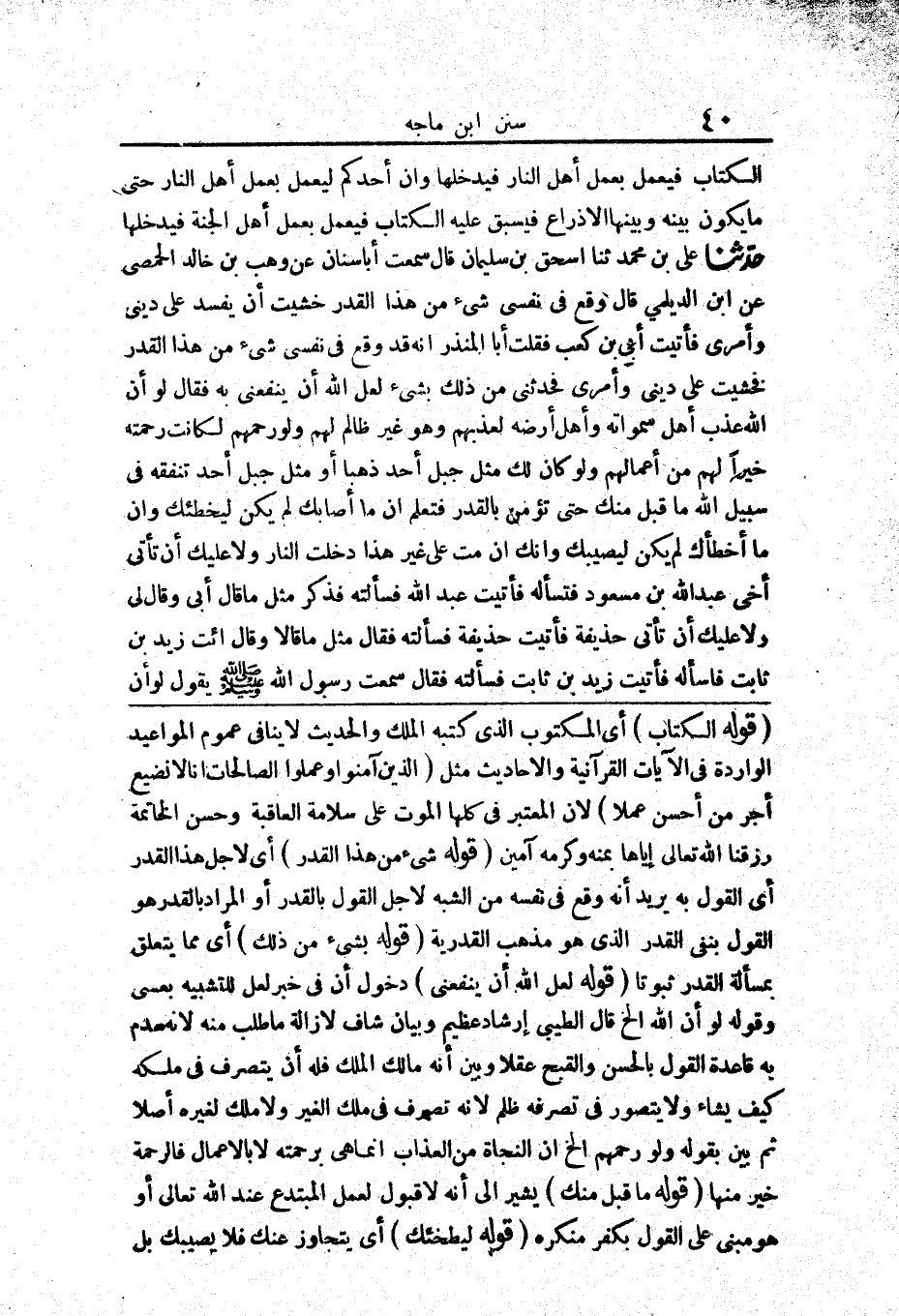 77 - حَدَّثَنَا عَلِيُّ بْنُ مُحَمَّدٍ حَدَّثَنَا إِسْحَقُ بْنُ سُلَيْمَانَ قَالَ سَمِعْتُ أَبَا سِنَانٍ عَنْ وَهْبِ بْنِ خَالِدٍ الْحِمْصِيِّ عَنْ ابْنِ الدَّيْلَمِيِّ قَالَ «وَقَعَ فِي نَفْسِي شَيْءٌ مِنْ هَذَا الْقَدَرِ خَشِيتُ أَنْ يُفْسِدَ عَلَيَّ دِينِي وَأَمْرِي فَأَتَيْتُ أُبَيَّ بْنَ كَعْبٍ فَقُلْتُ أَبَا الْمُنْذِرِ إِنَّهُ قَدْ وَقَعَ فِي نَفْسِي شَيْءٌ مِنْ هَذَا الْقَدَرِ فَخَشِيتُ عَلَى دِينِي وَأَمْرِي فَحَدِّثْنِي مِنْ ذَلِكَ بِشَيْءٍ لَعَلَّ اللَّهَ أَنْ يَنْفَعَنِي بِهِ فَقَالَ لَوْ أَنَّ اللَّهَ عَذَّبَ أَهْلَ سَمَاوَاتِهِ وَأَهْلَ أَرْضِهِ لَعَذَّبَهُمْ وَهُوَ غَيْرُ ظَالِمٍ لَهُمْ وَلَوْ رَحِمَهُمْ لَكَانَتْ رَحْمَتُهُ خَيْرًا لَهُمْ مِنْ أَعْمَالِهِمْ وَلَوْ كَانَ لَكَ مِثْلُ جَبَلِ أُحُدٍ ذَهَبًا أَوْ مِثْلُ جَبَلِ أُحُدٍ تُنْفِقُهُ فِي سَبِيلِ اللَّهِ مَا قُبِلَ مِنْكَ حَتَّى تُؤْمِنَ بِالْقَدَرِ فَتَعْلَمَ أَنَّ مَا أَصَابَكَ لَمْ يَكُنْ لِيُخْطِئَكَ وَأَنَّ مَا أَخْطَأَكَ لَمْ يَكُنْ لِيُصِيبَكَ وَأَنَّكَ إِنْ مُتَّ عَلَى غَيْرِ هَذَا دَخَلْتَ النَّارَ وَلَا عَلَيْكَ أَنْ تَأْتِيَ أَخِي عَبْدَ اللَّهِ بْنَ مَسْعُودٍ فَتَسْأَلَهُ فَأَتَيْتُ عَبْدَ اللَّهِ فَسَأَلْتُهُ فَذَكَرَ مِثْلَ مَا قَالَ أُبَيٌّ وَقَالَ لِي وَلَا عَلَيْكَ أَنْ تَأْتِيَ حُذَيْفَةَ فَأَتَيْتُ حُذَيْفَةَ فَسَأَلْتُهُ فَقَالَ مِثْلَ مَا قَالَا وَقَالَ ائْتِ زَيْدَ بْنَ ثَابِتٍ فَاسْأَلْهُ فَأَتَيْتُ زَيْدَ بْنَ ثَابِتٍ فَسَأَلْتُهُ فَقَالَ سَمِعْتُ رَسُولَ اللَّهِ صَلَّى اللَّهُ عَلَيْهِ وَسَلَّمَ يَقُولُ لَوْ أَنَّ اللَّهَ عَذَّبَ أَهْلَ سَمَاوَاتِهِ وَأَهْلَ أَرْضِهِ لَعَذَّبَهُمْ وَهُوَ غَيْرُ ظَالِمٍ لَهُمْ وَلَوْ رَحِمَهُمْ لَكَانَتْ رَحْمَتُهُ خَيْرًا لَهُمْ مِنْ أَعْمَالِهِمْ وَلَوْ كَانَ لَكَ مِثْلُ أُحُدٍ ذَهَبًا أَوْ مِثْلُ جَبَلِ أُحُدٍ ذَهَبًا تُنْفِقُهُ فِي سَبِيلِ اللَّهِ مَا قَبِلَهُ مِنْكَ حَتَّى تُؤْمِنَ بِالْقَدَرِ كُلِّهِ فَتَعْلَمَ أَنَّ مَا أَصَابَكَ لَمْ يَكُنْ لِيُخْطِئَكَ وَمَا أَخْطَأَكَ لَمْ يَكُنْ لِيُصِيبَكَ وَأَنَّكَ إِنْ مُتَّ عَلَى غَيْرِ هَذَا دَخَلْتَ النَّارَ»