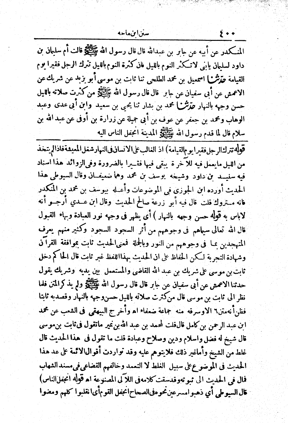 1333 - حَدَّثَنَا إِسْمَعِيلُ بْنُ مُحَمَّدٍ الطَّلْحِيُّ حَدَّثَنَا ثَابِتُ بْنُ مُوسَى أَبُو يَزِيدَ عَنْ شَرِيكٍ عَنْ الْأَعْمَشِ عَنْ أَبِي سُفْيَانَ عَنْ جَابِرٍ قَالَ «قَالَ رَسُولُ اللَّهِ صَلَّى اللَّهُ عَلَيْهِ وَسَلَّمَ مَنْ كَثُرَتْ صَلَاتُهُ بِاللَّيْلِ حَسُنَ وَجْهُهُ بِالنَّهَارِ»