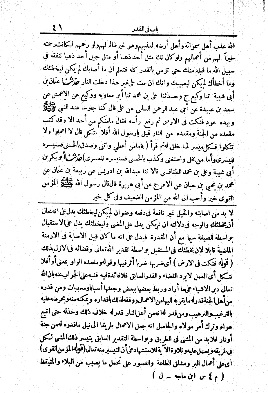 79 - حَدَّثَنَا أَبُو بَكْرِ بْنُ أَبِي شَيْبَةَ وَعَلِيُّ بْنُ مُحَمَّدٍ الطَّنَافِسِيُّ قَالَا حَدَّثَنَا عَبْدُ اللَّهِ بْنُ إِدْرِيسَ عَنْ رَبِيعَةَ بْنِ عُثْمَانَ عَنْ مُحَمَّدِ بْنِ يَحْيَى بْنِ حَبَّانَ عَنْ الْأَعْرَجِ عَنْ أَبِي هُرَيْرَةَ قَالَ «قَالَ رَسُولُ اللَّهِ صَلَّى اللَّهُ عَلَيْهِ وَسَلَّمَ الْمُؤْمِنُ الْقَوِيُّ خَيْرٌ وَأَحَبُّ إِلَى اللَّهِ مِنْ الْمُؤْمِنِ الضَّعِيفِ وَفِي كُلٍّ خَيْرٌ احْرِصْ عَلَى مَا يَنْفَعُكَ وَاسْتَعِنْ بِاللَّهِ وَلَا تَعْجَزْ فَإِنْ أَصَابَكَ شَيْءٌ فَلَا تَقُلْ لَوْ أَنِّي فَعَلْتُ كَذَا وَكَذَا وَلَكِنْ قُلْ قَدَّرَ اللَّهُ وَمَا شَاءَ فَعَلَ فَإِنَّ لَوْ تَفْتَحُ عَمَلَ الشَّيْطَانِ»