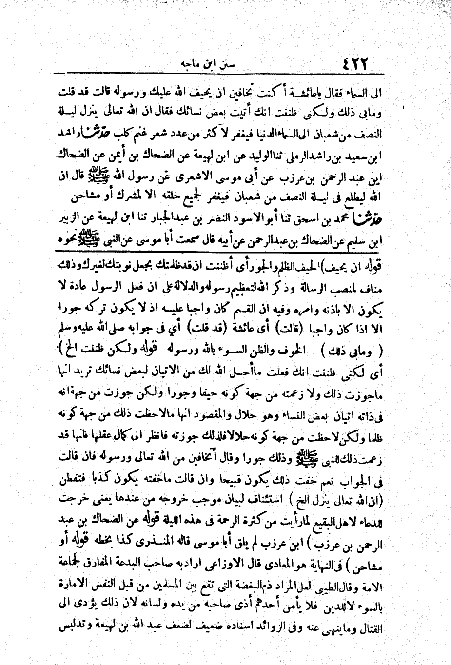 1390 - حَدَّثَنَا رَاشِدُ بْنُ سَعِيدِ بْنِ رَاشِدٍ الرَّمْلِيُّ حَدَّثَنَا الْوَلِيدُ عَنْ ابْنِ لَهِيعَةَ عَنْ الضَّحَّاكِ بْنِ أَيْمَنَ عَنْ الضَّحَّاكِ بْنِ عَبْدِ الرَّحْمَنِ بْنِ عَرْزَبٍ عَنْ أَبِي مُوسَى الْأَشْعَرِيِّ «عَنْ رَسُولِ اللَّهِ صَلَّى اللَّهُ عَلَيْهِ وَسَلَّمَ قَالَ إِنَّ اللَّهَ لَيَطَّلِعُ فِي لَيْلَةِ النِّصْفِ مِنْ شَعْبَانَ فَيَغْفِرُ لِجَمِيعِ خَلْقِهِ إِلَّا لِمُشْرِكٍ أَوْ مُشَاحِنٍ» حَدَّثَنَا مُحَمَّدُ بْنُ إِسْحَقَ حَدَّثَنَا أَبُو الْأَسْوَدِ النَّضْرُ بْنُ عَبْدِ الْجَبَّارِ حَدَّثَنَا ابْنُ لَهِيعَةَ عَنْ الزُّبَيْرِ بْنِ سُلَيْمٍ عَنْ الضَّحَّاكِ بْنِ عَبْدِ الرَّحْمَنِ عَنْ أَبِيهِ قَالَ سَمِعْتُ أَبَا مُوسَى عَنْ النَّبِيِّ صَلَّى اللَّهُ عَلَيْهِ وَسَلَّمَ نَحْوَهُ