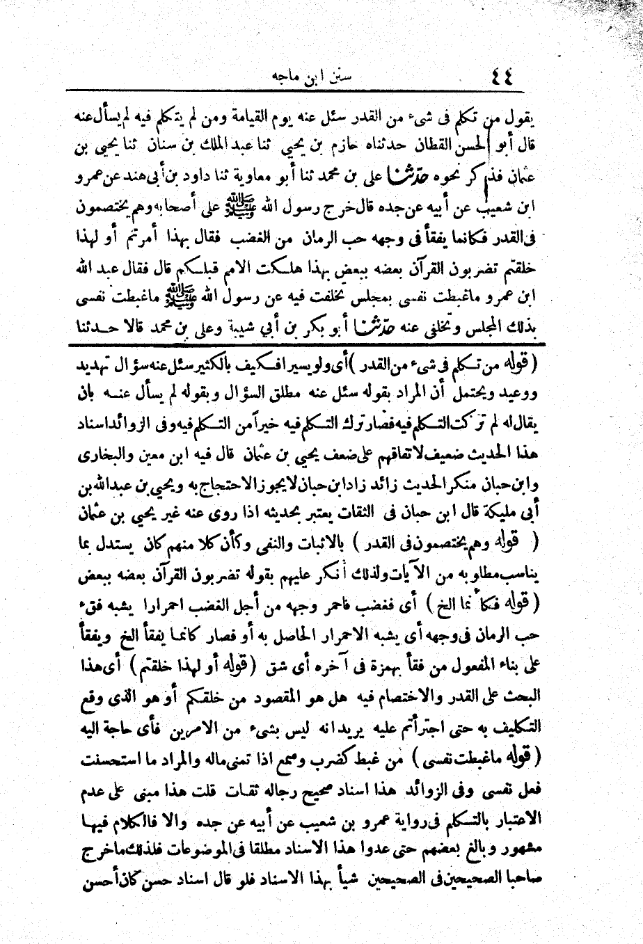 قَوْلُهُ: (وَهُمْ يَخْتَصِمُونَ فِي الْقَدَرِ) بِالْإِثْبَاتِ وَالنَّفْيِ وَكَأَنَّ كُلًّا مِنْهُمْ كَانَ يَسْتَدِلُّ بِمَا يُنَاسِبُ مَطْلُوبَهُ مِنَ الْآيَاتِ وَلِذَلِكَ أَنْكَرَ عَلَيْهِمْ بِقَوْلِهِ: تَضْرِبُونَ الْقُرْآنَ بَعْضَهُ بِبَعْضٍ قَوْلُهُ: (فَكَأَنَّمَا إِلَخْ) أَيْ فَغَضِبَ فَاحْمَرَّ وَجْهُهُ مِنْ أَجْلِ الْغَضَبِ احْمِرَارًا يُشْبِهُ فَقْءَ حَبِّ الرُّمَّانِ فِي وَجْهِهِ أَيْ يُشْبِهُ الِاحْمِرَارَ الْحَاصِلَ بِهِ أَوْ فَصَارَ كَأَنَّمَا يُفْقَأُ إِلَخْ وَيُفْقَأُ عَلَى بِنَاءِ الْمَفْعُولِ مِنْ فَقَأَ بِهَمْزَةٍ فِي آخِرِهِ أَيْ شُقَّ قَوْلُهُ: (أَوَ لِهَذَا خُلِقْتُمْ) أَيْ هَذَا الْبَحْثُ عَلَى الْقَدَرِ وَالِاخْتِصَامِ فِيهِ هَلْ هُوَ الْمَقْصُودُ مِنْ خَلْقِكُمْ أَوْ هُوَ الَّذِي وَقَعَ التَّكْلِيفُ بِهِ حَتَّى اجْتَرَأْتُمْ عَلَيْهِ يُرِيدُ أَنَّهُ لَيْسَ بِشَيْءٍ مِنَ الْأَمْرَيْنِ فَأَيُّ حَاجَةٍ إِلَيْهِ قَوْلُهُ (مَا غَبَطْتُ نَفْسِي) مِنْ غَبَطَ كَضَرَبَ وَسَمِعَ إِذَا تَمَنَّى مَا لَهُ وَالْمُرَادُ مَا اسْتَحْسَنْتُ فِعْلَ نَفْسِي وَفِي الزَّوَائِدِ هَذَا إِسْنَادٌ صَحِيحٌ رِجَالُهُ ثِقَاتٌ قُلْتُ: هَذَا مَبْنِيٌّ عَلَى عَدَمِ الِاعْتِبَارِ بِالتَّكَلُّمِ فِي رِوَايَةِ عَمْرِو بْنِ شُعَيْبٍ عَنْ أَبِيهِ عَنْ جَدِّهِ وَإِلَّا فَالْكَلَامُ فِيهَا مَشْهُورٌ وَبَالَغَ بَعْضُهُمْ حَتَّى عَدُّوا هَذَا الْإِسْنَادَ مُطْلَقًا فِي الْمَوْضُوعَاتِ فَلِذَلِكَ مَا خَرَّجَ صَاحِبَا الصَّحِيحَيْنِ فِي الصَّحِيحَيْنِ شَيْئًا بِهَذَا الْإِسْنَادِ فَلَوْ قَالَ: إِسْنَادٌ حَسَنٌ كَانْ أَحْسَنَ