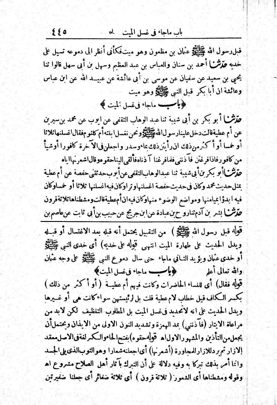 1458 - حَدَّثَنَا أَبُو بَكْرِ بْنُ أَبِي شَيْبَةَ حَدَّثَنَا عَبْدُ الْوَهَّابِ الثَّقَفِيُّ عَنْ أَيُّوبَ عَنْ مُحَمَّدِ بْنِ سِيرِينَ عَنْ أُمِّ عَطِيَّةَ قَالَتْ «دَخَلَ عَلَيْنَا رَسُولُ اللَّهِ صَلَّى اللَّهُ عَلَيْهِ وَسَلَّمَ وَنَحْنُ نُغَسِّلُ ابْنَتَهُ أُمَّ كُلْثُومٍ فَقَالَ اغْسِلْنَهَا ثَلَاثًا أَوْ خَمْسًا أَوْ أَكْثَرَ مِنْ ذَلِكَ إِنْ رَأَيْتُنَّ ذَلِكَ بِمَاءٍ وَسِدْرٍ وَاجْعَلْنَ فِي الْآخِرَةِ كَافُورًا أَوْ شَيْئًا مِنْ كَافُورٍ فَإِذَا فَرَغْتُنَّ فَآذِنَّنِي فَلَمَّا فَرَغْنَا آذَنَّاهُ فَأَلْقَى إِلَيْنَا حَقْوَهُ وَقَالَ أَشْعِرْنَهَا إِيَّاهُ»