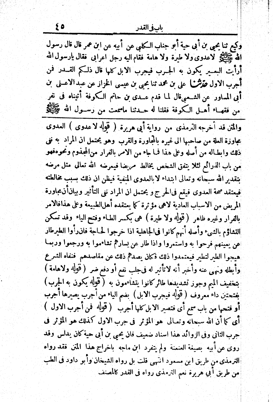 قَوْلُهُ: (لَا عَدْوَى) الْعَدْوَى مُجَاوَزَةُ الْعِلَّةِ مِنْ صَاحِبِهَا إِلَى غَيْرِهِ بِالْمُجَاوَرَةِ وَالْقُرْبِ وَهُوَ يَحْتَمِلُ أَنَّ الْمُرَادَ بِهِ نَفْيُ ذَلِكَ وَإِبْطَالُهُ مِنْ أَصْلِهِ وَعَلَى هَذَا فَمَا جَاءَ مِنَ الْأَمْرِ بِالْفِرَارِ مِنَ الْمَجْذُومِ وَنَحْوِهِ فَهُوَ مِنْ بَابِ الذَّرَائِعِ لِئَلَّا يَتَّفِقَ الشَّخْصُ يُخَالِطُ مَرِيضًا فَيُمْرِضُهُ اللَّهُ تَعَالَى مِثْلَ مَرَضِهِ بِتَقْدِيرِ اللَّهِ سُبْحَانَهُ وَتَعَالَى ابْتِدَاءً لَا بِالْعَدْوَى الْمَنْفِيَّةِ فَيُظَنُّ أَنَّ ذَلِكَ بِسَبَبِ مُخَالَطَتِهِ فَيَعْتَقِدُ صِحَّةَ الْعَدْوَى فَيَقَعُ فِي الْحَرَجِ وَيَحْتَمِلُ أَنَّ الْمُرَادَ نَفْيُ التَّأْثِيرِ وَبَيَانُ أَنَّ مُجَاوَرَةَ الْمَرِيضِ مِنَ الْأَسْبَابِ الْعَادِيَةِ لَا هِيَ مُؤَثِّرَةٌ كَمَا يَعْتَقِدُهُ أَهْلُ الطَّبِيعَةِ وَعَلَى هَذَا فَالْأَمْرُ بِالْفِرَارِ وَغَيْرِهِ ظَاهِرٌ قَوْلُهُ: (وَلَا طِيَرَةَ) هِيَ بِكَسْرِ الطَّاءِ وَفَتْحِ الْيَاءِ وَقَدْ سُكِّنَ التَّشَاؤُمُ بِالشَّيْءِ وَأَصْلُهُ أَنَّهُمْ كَانُوا فِي الْجَاهِلِيَّةِ إِذَا خَرَجُوا لِحَاجَةٍ فَإِنْ رَأَوُا الطَّيْرَ طَارَ عَنْ يَمِينِهِمْ فَرِحُوا بِهِ وَاسْتَمَرُّوا وَإِذَا طَارَ عَنْ يَسَارِهِمْ تَشَاءَمُوا بِهِ وَرَجَعُوا وَرُبَّمَا هَيَّجُوا الطَّيْرَ لِتَطِيرَ فَيَعْتَمِدُوا ذَلِكَ فَكَانَ يَصُدُّهُمْ ذَلِكَ عَنْ مَقَاصِدِهِمْ فَنَفَاهُ الشَّرْعُ وَأَبْطَلَهُ وَنَهَى عَنْهُ وَأَخْبَرَ أَنَّهُ لَا تَأْثِيرَ لَهُ فِي جَلْبِ نَفْعٍ أَوْ دَفْعِ ضُرٍّ قَوْلُهُ: (وَلَا هَامَةَ) بِتَخْفِيفِ الْمِيمِ وَجُوِّزَ تَشْدِيدُهَا طَائِرٌ كَانُوا يَتَشَاءَمُونَ بِهِ قَوْلُهُ: (يَكُونُ بِهِ الْجَرَبُ) فَتْحَتَيْنِ دَاءٌ مَعْرُوفٌ قَوْلُهُ: (فَيُجْرِبُ الْإِبِلَ) بِضَمِّ الْيَاءِ مِنْ أَجْرَبَ يَصِيرُهَا أَجْرَبَ أَوْ فَتْحِهَا مِنْ بَابِ سَمِعَ أَيْ فَتَصِيرُ الْإِبِلُ كُلُّهَا أَجْرَبَ قَوْلُهُ: (فَمَنْ أَجْرَبَ الْأَوَّلَ) أَيْ كَمَا أَنَّ اللَّهَ سُبْحَانَهُ وَتَعَالَى هُوَ الْمُؤَثِّرُ فِي جَرَبِ الْأَوَّلِ كَذَلِكَ هُوَ الْمُؤَثِّرُ فِي جَرَبِ الثَّانِي وَفِي الزَّوَائِدِ هَذَا إِسْنَادٌ ضَعِيفٌ فَإِنَّ يَحْيَى بْنَ أَبِي حَيَّةَ كَانَ يُدَلِّسُ وَقَدْ رَوَى عَنْ أَبِيهِ بِصِيغَةِ الْعَنْعَنَةِ وَلَمْ يَتَفَرَّدِ ابْنُ مَاجَهْ بِإِخْرَاجِ هَذَا الْمَتْنِ فَقَدْ رَوَاهُ التِّرْمِذِيُّ مِنْ طَرِيقِ ابْنِ مَسْعُودٍ انْتَهَى قُلْتُ: بَلْ رَوَاهُ الشَّيْخَانِ وَأَبُو دَاوُدَ فِي الطِّبِّ مِنْ طَرِيقِ أَبِي هُرَيْرَةَ نَعَمِ التِّرْمِذِيُّ رَوَاهُ فِي الْقَدَرِ كَالْمُصَنِّفِ.
