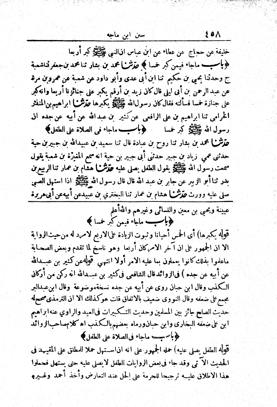 1504 - حَدَّثَنَا أَبُو هِشَامٍ الرِّفَاعِيُّ وَمُحَمَّدُ بْنُ الصَّبَّاحِ وَأَبُو بَكْرِ بْنُ خَلَّادٍ قَالُوا حَدَّثَنَا يَحْيَى بْنُ الْيَمَانِ عَنْ الْمِنْهَالِ بْنِ خَلِيفَةَ عَنْ حَجَّاجٍ عَنْ عَطَاءٍ عَنْ ابْنِ عَبَّاسٍ «أَنَّ النَّبِيَّ صَلَّى اللَّهُ عَلَيْهِ وَسَلَّمَ كَبَّرَ أَرْبَعًا»