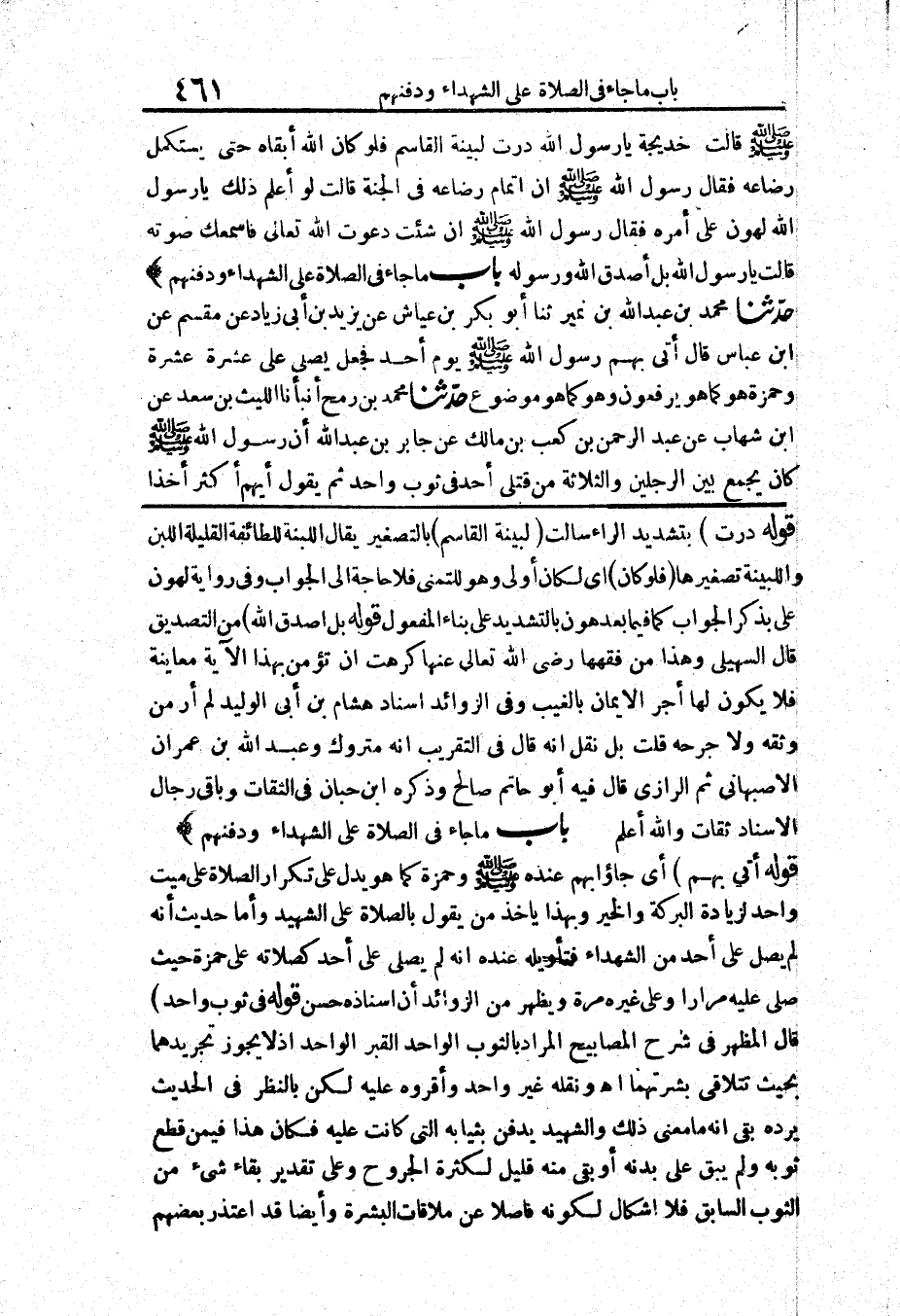 قَوْلُهُ: (أُتِيَ بِهِمْ) أَيْ جَاءُوا بِهِمْ عِنْدَهُ ـ صَلَّى اللَّهُ عَلَيْهِ وَسَلَّمَ ـ وَحَمْزَةُ كَمَا هُوَ يَدُلُّ عَلَى تَكْرَارِ الصَّلَاةِ عَلَى مَيِّتٍ وَاحِدٍ لِزِيَادَةِ الْبَرَكَةِ وَالْخَيْرِ وَبِهَذَا يَأْخُذُ مَنْ يَقُولُ بِالصَّلَاةِ عَلَى الشَّهِيدِ وَأَمَّا حَدِيثُ أَنَّهُ لَمْ يُصَلِّ عَلَى أَحَدٍ مِنَ الشُّهَدَاءِ فَتَأْوِيلُهُ عِنْدَهُ أَنَّهُ لَمْ يُصَلِّ عَلَى أَحَدٍ كَصَلَاتِهِ عَلَى حَمْزَةَ حَيْثُ صَلَّى عَلَيْهِ مِرَارًا وَعَلَى غَيْرِهِ مَرَّةً وَيَظْهَرُ مِنَ الزَّوَائِدِ أَنَّ إِسْنَادَهُ حَسَنٌ.