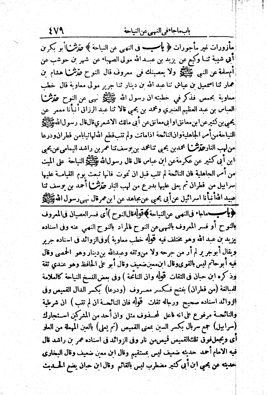 1579 - حَدَّثَنَا أَبُو بَكْرِ بْنُ أَبِي شَيْبَةَ حَدَّثَنَا وَكِيعٌ عَنْ يَزِيدَ بْنِ عَبْدِ اللَّهِ مَوْلَى الصَّهْبَاءِ عَنْ شَهْرِ بْنِ حَوْشَبٍ عَنْ أُمِّ سَلَمَةَ «عَنْ النَّبِيِّ صَلَّى اللَّهُ عَلَيْهِ وَسَلَّمَ {وَلَا يَعْصِينَكَ فِي مَعْرُوفٍ} [الممتحنة: 12] قَالَ النَّوْحُ»