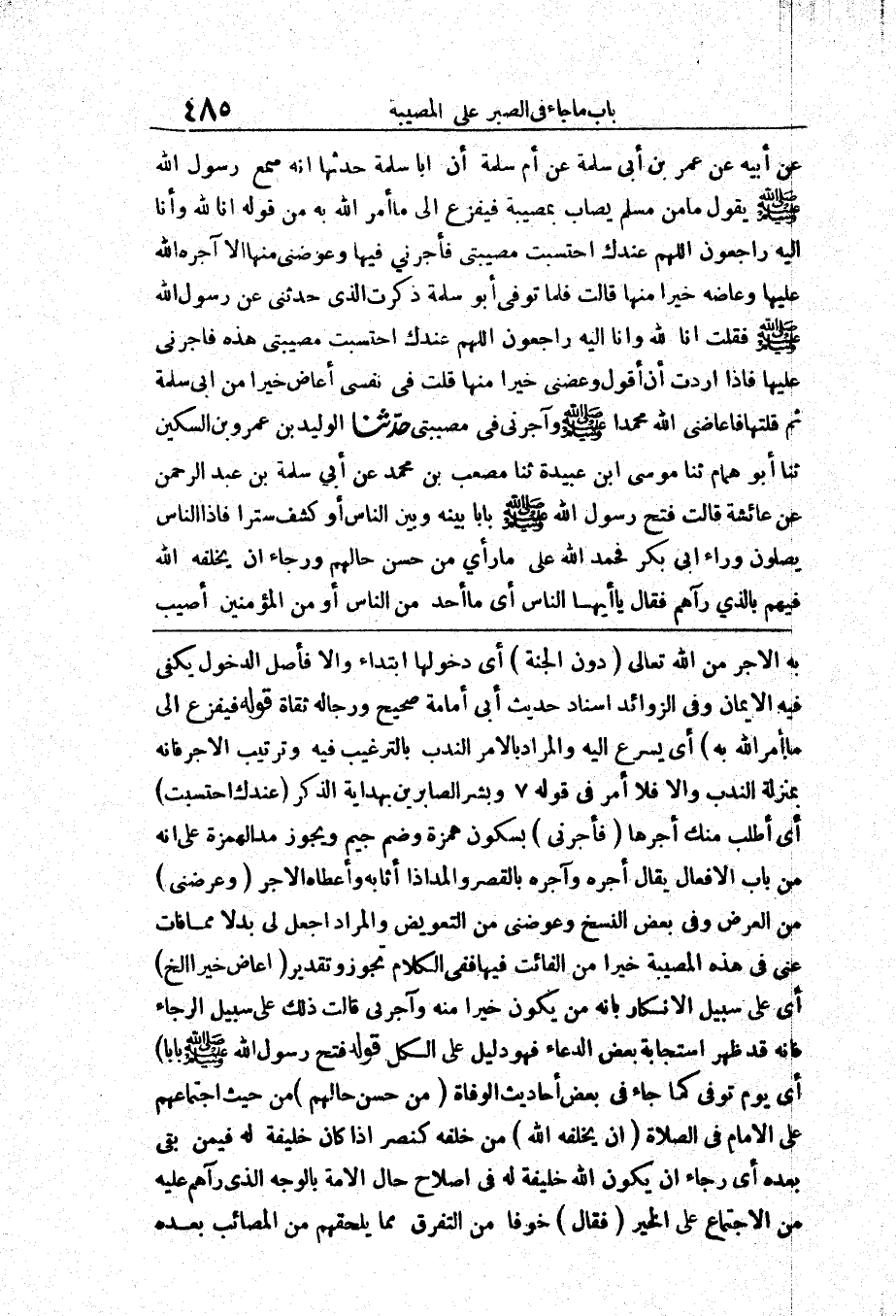 1598 - حَدَّثَنَا أَبُو بَكْرِ بْنُ أَبِي شَيْبَةَ حَدَّثَنَا يَزِيدُ بْنُ هَارُونَ أَنْبَأَنَا عَبْدُ الْمَلِكِ بْنُ قُدَامَةَ الْجُمَحِيُّ عَنْ أَبِيهِ عَنْ عُمَرَ بْنِ أَبِي سَلَمَةَ عَنْ أُمِّ سَلَمَةَ أَنَّ أَبَا سَلَمَةَ حَدَّثَهَا «أَنَّهُ سَمِعَ رَسُولَ اللَّهِ صَلَّى اللَّهُ عَلَيْهِ وَسَلَّمَ يَقُولُ مَا مِنْ مُسْلِمٍ يُصَابُ بِمُصِيبَةٍ فَيَفْزَعُ إِلَى مَا أَمَرَ اللَّهُ بِهِ مِنْ قَوْلِهِ إِنَّا لِلَّهِ وَإِنَّا إِلَيْهِ رَاجِعُونَ اللَّهُمَّ عِنْدَكَ احْتَسَبْتُ مُصِيبَتِي فَأْجُرْنِي فِيهَا وَعَوِّضْنِي مِنْهَا إِلَّا آجَرَهُ اللَّهُ عَلَيْهَا وَعَاضَهُ خَيْرًا مِنْهَا» قَالَتْ فَلَمَّا تُوُفِّيَ أَبُو سَلَمَةَ ذَكَرْتُ الَّذِي حَدَّثَنِي عَنْ رَسُولِ اللَّهِ صَلَّى اللَّهُ عَلَيْهِ وَسَلَّمَ فَقُلْتُ إِنَّا لِلَّهِ وَإِنَّا إِلَيْهِ رَاجِعُونَ اللَّهُمَّ عِنْدَكَ احْتَسَبْتُ مُصِيبَتِي هَذِهِ فَأْجُرْنِي عَلَيْهَا فَإِذَا أَرَدْتُ أَنْ أَقُولَ وَعِضْنِي خَيْرًا مِنْهَا قُلْتُ فِي نَفْسِي أُعَاضُ خَيْرًا مِنْ أَبِي سَلَمَةَ ثُمَّ قُلْتُهَا فَعَاضَنِي اللَّهُ مُحَمَّدًا صَلَّى اللَّهُ عَلَيْهِ وَسَلَّمَ وَآجَرَنِي فِي مُصِيبَتِي