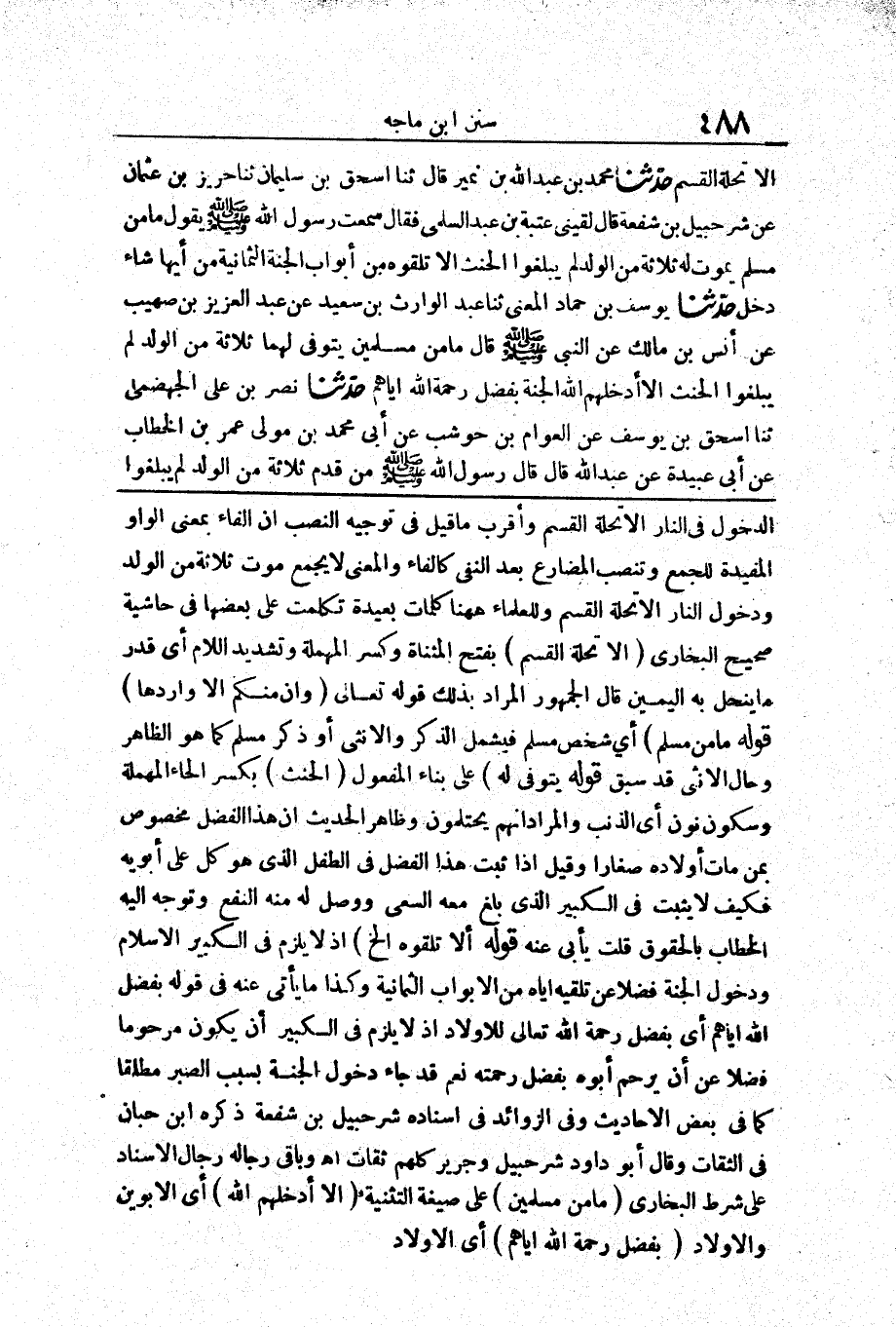الدُّخُولُ فِي النَّارِ إِلَّا تَحِلَّةَ الْقَسَمِ وَأَقْرَبُ مَا قِيلَ فِي تَوْجِيهِ النَّصْبِ أَنَّ الْفَاءَ بِمَعْنَى الْوَاوِ الْمُفِيدَةِ لِلْجَمْعِ وَتَنْصِبُ الْمُضَارِعَ بَعْدَ النَّفْيِ كَالْفَاءِ وَالْمَعْنَى لَا يُجْمَعُ مَوْتُ ثَلَاثَةٍ مِنَ الْوَلَدِ وَدُخُولُ النَّارِ إِلَّا تَحِلَّةَ الْقَسَمِ وَلِلْعُلَمَاءِ هَاهُنَا كَلِمَاتٌ بَعِيدَةٌ تَكَلَّمْتُ عَلَى بَعْضِهَا فِي حَاشِيَةِ صَحِيحِ الْبُخَارِيِّ (إِلَّا تَحِلَّةَ الْقَسَمِ) بِفَتْحِ الْمُثَنَّاةِ وَكَسْرِ الْمُهْمَلَةِ وَتَشْدِيدِ اللَّامِ أَيْ قَدْرَ مَا يَنْحَلُّ بِهِ الْيَمِينُ قَالَ الْجُمْهُورُ الْمُرَادُ بِذَلِكَ قَوْلُهُ: تَعَالَى {وَإِنْ مِنْكُمْ إِلَّا وَارِدُهَا} [مريم: 71]