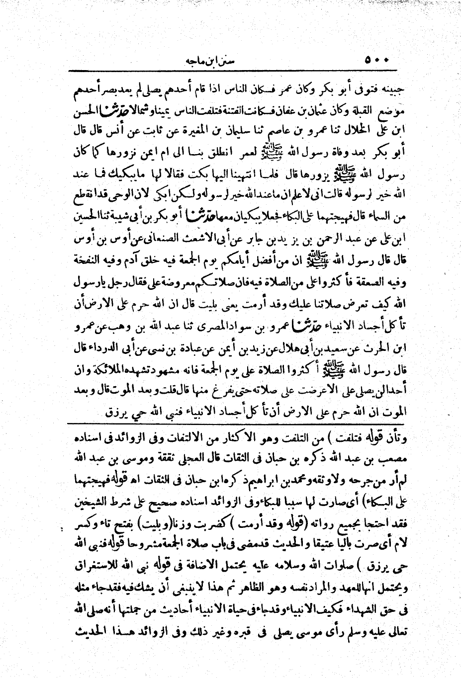 1637 - حَدَّثَنَا عَمْرُو بْنُ سَوَّادٍ الْمِصْرِيُّ حَدَّثَنَا عَبْدُ اللَّهِ بْنُ وَهْبٍ عَنْ عَمْرِو بْنِ الْحَارِثِ عَنْ سَعِيدِ بْنِ أَبِي هِلَالٍ عَنْ زَيْدِ بْنِ أَيْمَنَ عَنْ عُبَادَةَ بْنِ نُسَيٍّ عَنْ أَبِي الدَّرْدَاءِ قَالَ «قَالَ رَسُولُ اللَّهِ صَلَّى اللَّهُ عَلَيْهِ وَسَلَّمَ أَكْثِرُوا الصَّلَاةَ عَلَيَّ يَوْمَ الْجُمُعَةِ فَإِنَّهُ مَشْهُودٌ تَشْهَدُهُ الْمَلَائِكَةُ وَإِنَّ أَحَدًا لَنْ يُصَلِّيَ عَلَيَّ إِلَّا عُرِضَتْ عَلَيَّ صَلَاتُهُ حَتَّى يَفْرُغَ مِنْهَا قَالَ قُلْتُ وَبَعْدَ الْمَوْتِ قَالَ وَبَعْدَ الْمَوْتِ إِنَّ اللَّهَ حَرَّمَ عَلَى الْأَرْضِ أَنْ تَأْكُلَ أَجْسَادَ الْأَنْبِيَاءِ فَنَبِيُّ اللَّهِ حَيٌّ يُرْزَقُ»
