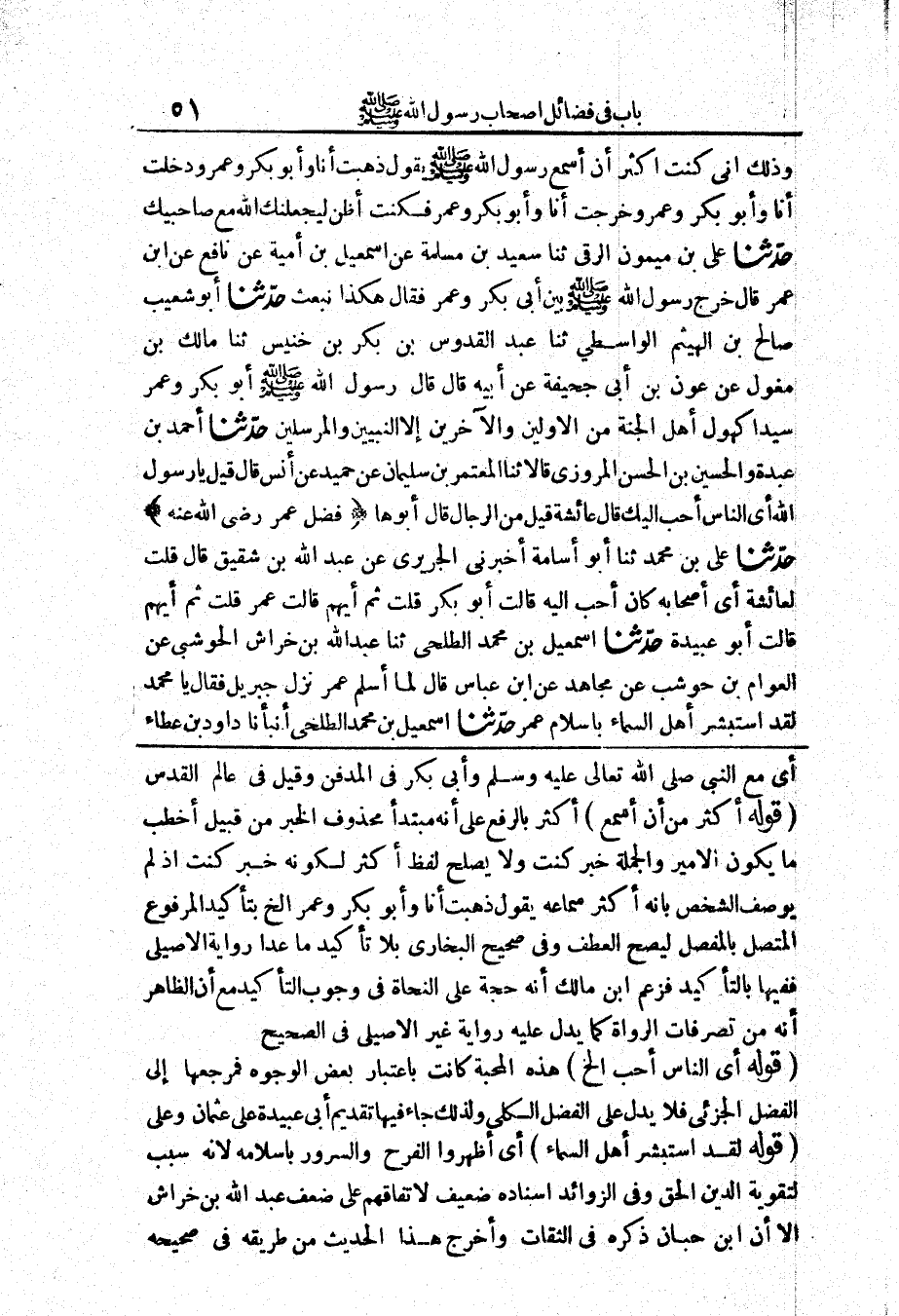 103 - حَدَّثَنَا إِسْمَعِيلُ بْنُ مُحَمَّدٍ الطَّلْحِيُّ حَدَّثَنَا عَبْدُ اللَّهِ بْنُ خِرَاشٍ الْحَوْشَبِيُّ عَنْ الْعَوَّامِ بْنِ حَوْشَبٍ عَنْ مُجَاهِدٍ عَنْ ابْنِ عَبَّاسٍ قَالَ «لَمَّا أَسْلَمَ عُمَرُ نَزَلَ جِبْرِيلُ فَقَالَ يَا مُحَمَّدُ لَقَدْ اسْتَبْشَرَ أَهْلُ السَّمَاءِ بِإِسْلَامِ عُمَرَ»