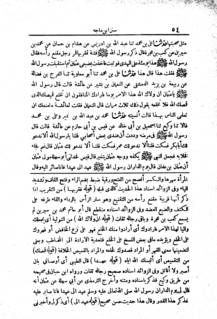 111 - حَدَّثَنَا عَلِيُّ بْنُ مُحَمَّدٍ حَدَّثَنَا عَبْدُ اللَّهِ بْنُ إِدْرِيسَ عَنْ هِشَامِ بْنِ حَسَّانَ عَنْ مُحَمَّدِ بْنِ سِيرِينَ عَنْ كَعْبِ بْنِ عُجْرَةَ قَالَ «ذَكَرَ رَسُولُ اللَّهِ صَلَّى اللَّهُ عَلَيْهِ وَسَلَّمَ فِتْنَةً فَقَرَّبَهَا فَمَرَّ رَجُلٌ مُقَنَّعٌ رَأْسُهُ فَقَالَ رَسُولُ اللَّهِ صَلَّى اللَّهُ عَلَيْهِ وَسَلَّمَ هَذَا يَوْمَئِذٍ عَلَى الْهُدَى فَوَثَبْتُ فَأَخَذْتُ بِضَبْعَيْ عُثْمَانَ ثُمَّ اسْتَقْبَلْتُ رَسُولَ اللَّهِ صَلَّى اللَّهُ عَلَيْهِ وَسَلَّمَ فَقُلْتُ هَذَا قَالَ هَذَا»
