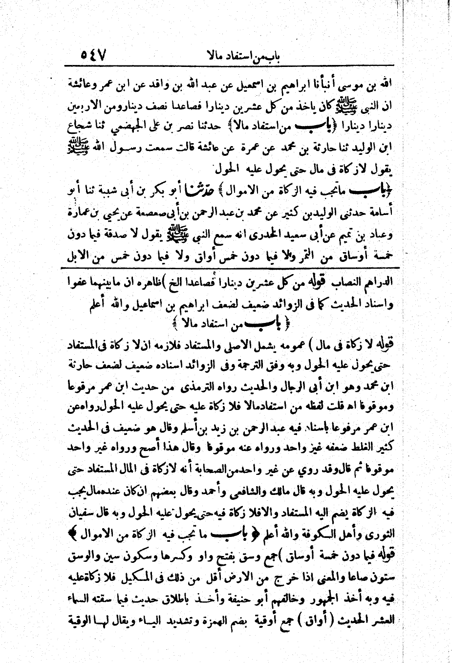 قَوْلُهُ (لَا زَكَاةَ فِي مَالٍ) عُمُومُهُ يَشْمَلُ الْأَصْلِيَّ وَالْمُسْتَفَادَ فَلَازِمُهُ أَنْ لَا زَكَاةَ فِي الْمُسْتَفَادِ حَتَّى يَحُولَ عَلَيْهِ الْحَوْلُ وَبِهِ وُفِّقَ لِلتَّرْجَمَةِ وَفِي الزَّوَائِدِ إِسْنَادُهُ ضَعِيفٌ لِضَعْفِ حَارِثَةَ ابْنِ مُحَمَّدٍ وَهُوَ ابْنُ أَبِي الرِّجَالِ وَالْحَدِيثُ رَوَاهُ التِّرْمِذِيُّ مِنْ حَدِيثِ ابْنِ عُمَرَ مَرْفُوعًا وَمَوْقُوفًا اهـ قُلْتُ لَفْظُهُ «مَنِ اسْتَفَادَ مَالًا فَلَا زَكَاةَ عَلَيْهِ حَتَّى يَحُولَ عَلَيْهِ الْحَوْلُ» رَوَاهُ عَنِ ابْنِ عُمَرَ مَرْفُوعًا بِإِسْنَادٍ فِيهِ عَبْدُ الرَّحْمَنِ بْنُ زَيْدِ بْنِ أَسْلَمَ وَقَالَ هُوَ ضَعِيفٌ فِي الْحَدِيثِ كَثِيرُ الْغَلَطِ ضَعَّفَهُ غَيْرُ وَاحِدٍ وَرَوَاهُ عَنْهُ مَوْقُوفًا وَقَالَ هَذَا أَصَحُّ وَرَوَاهُ غَيْرُ وَاحِدٍ مَوْقُوفًا ثُمَّ قَالَ وَقَدْ رُوِيَ عَنْ غَيْرِ وَاحِدٍ مِنَ الصَّحَابَةِ أَنَّهُ لَا زَكَاةَ فِي الْمَالِ الْمُسْتَفَادِ حَتَّى يَحُولَ عَلَيْهِ الْحَوْلُ وَبِهِ قَالَ مَالِكٌ وَالشَّافِعِيُّ وَأَحْمَدُ وَقَالَ بَعْضُهُمْ إِنْ كَانَ عِنْدَهُ مَالٌ يَجِبُ فِيهِ الزَّكَاةُ يَضُمُّ إِلَيْهِ الْمُسْتَفَادَ وَإِلَّا فَلَا زَكَاةَ فِيهِ حَتَّى يَحُولَ عَلَيْهِ الْحَوْلُ وَبِهِ قَالَ سُفْيَانُ الثَّوْرَيُّ وَأَهْلُ الْكُوفَةِ وَاللَّهُ أَعْلَمُ
